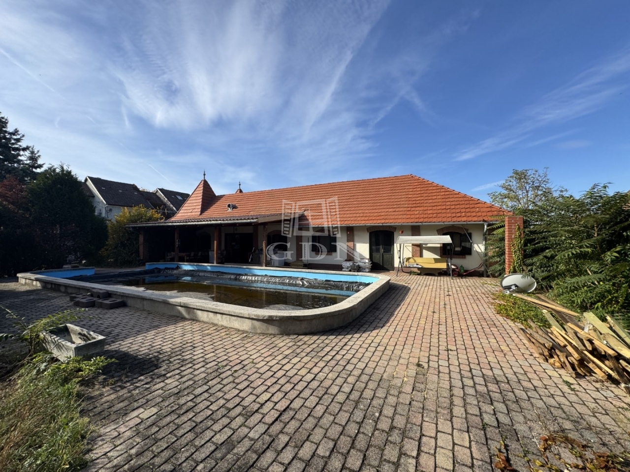 T-004808. Székesfehérváron, Öreghegyen, részben panorámás , 4044m2 –es építési telek 110m2-es családiházzal, 100m2 medencével, 365m2-es „U” alakú épülettel eladó!