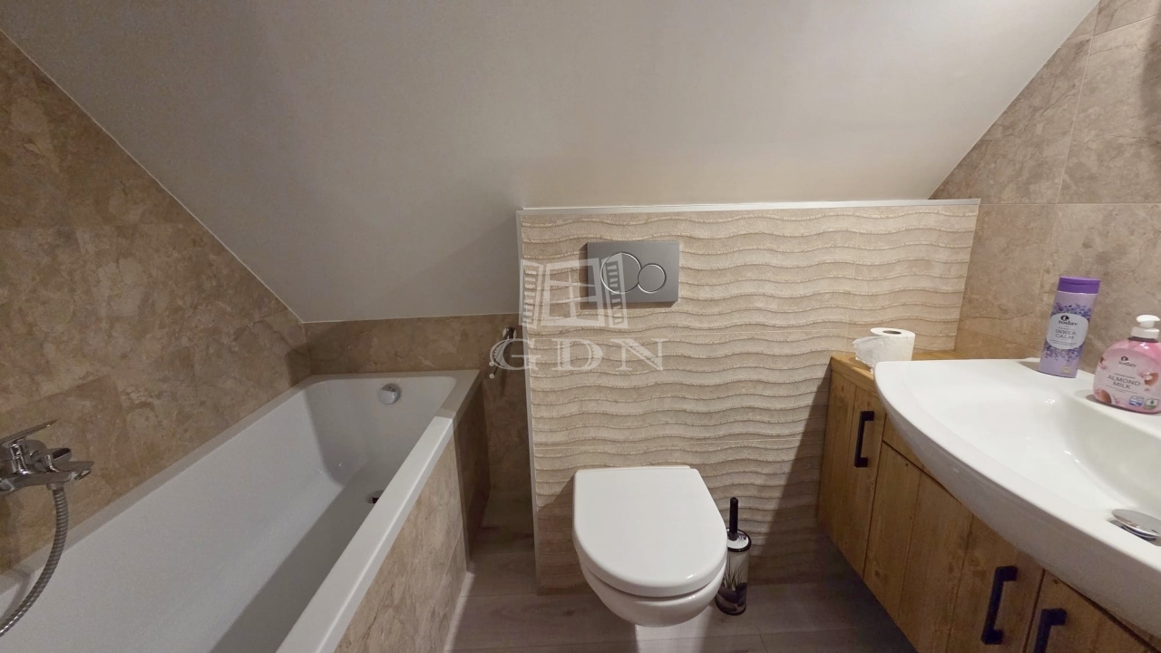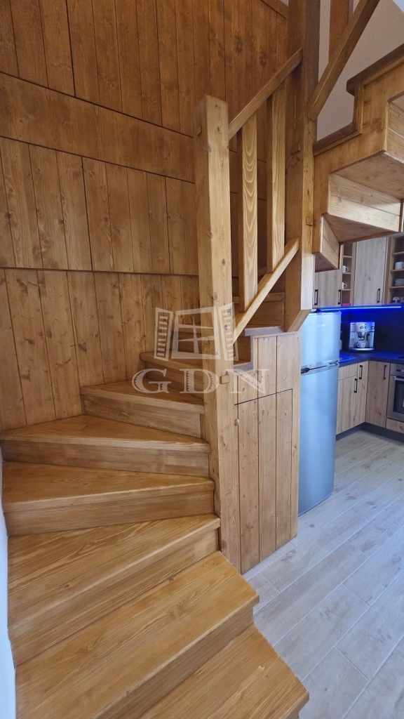 Az emeleten további két hálószoba és egy fürdőszoba található, így ideális vendégek vagy család számára is. A földszinti látszó fa gerendák meleg, természetes hangulatot teremtenek, amely harmonikusan illeszkedik a modern belső térhez.