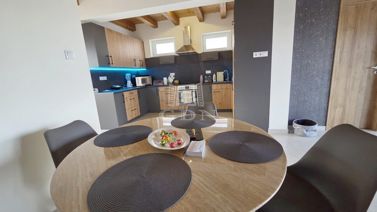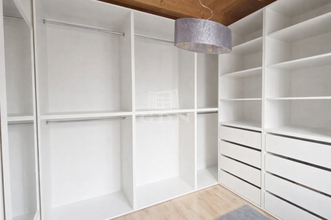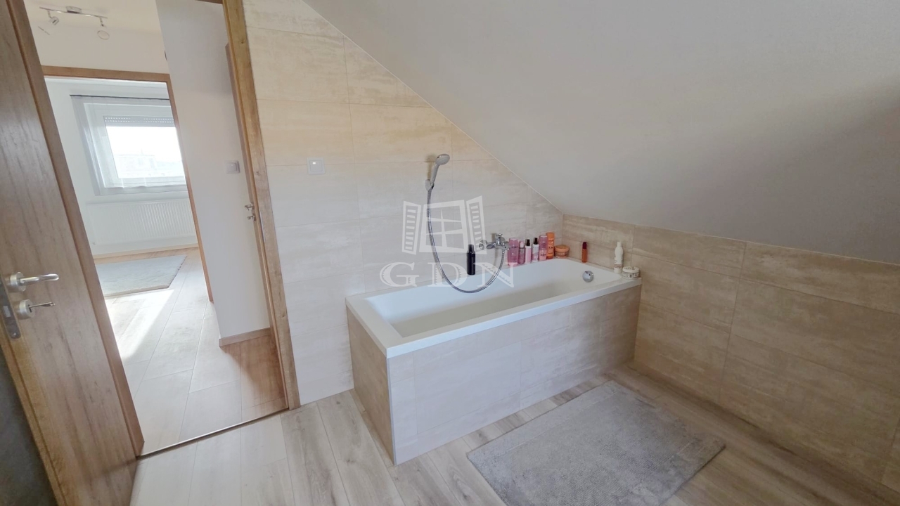 Az emeleten további két hálószoba és egy fürdőszoba található, így ideális vendégek vagy család számára is. A földszinti látszó fa gerendák meleg, természetes hangulatot teremtenek, amely harmonikusan illeszkedik a modern belső térhez.
