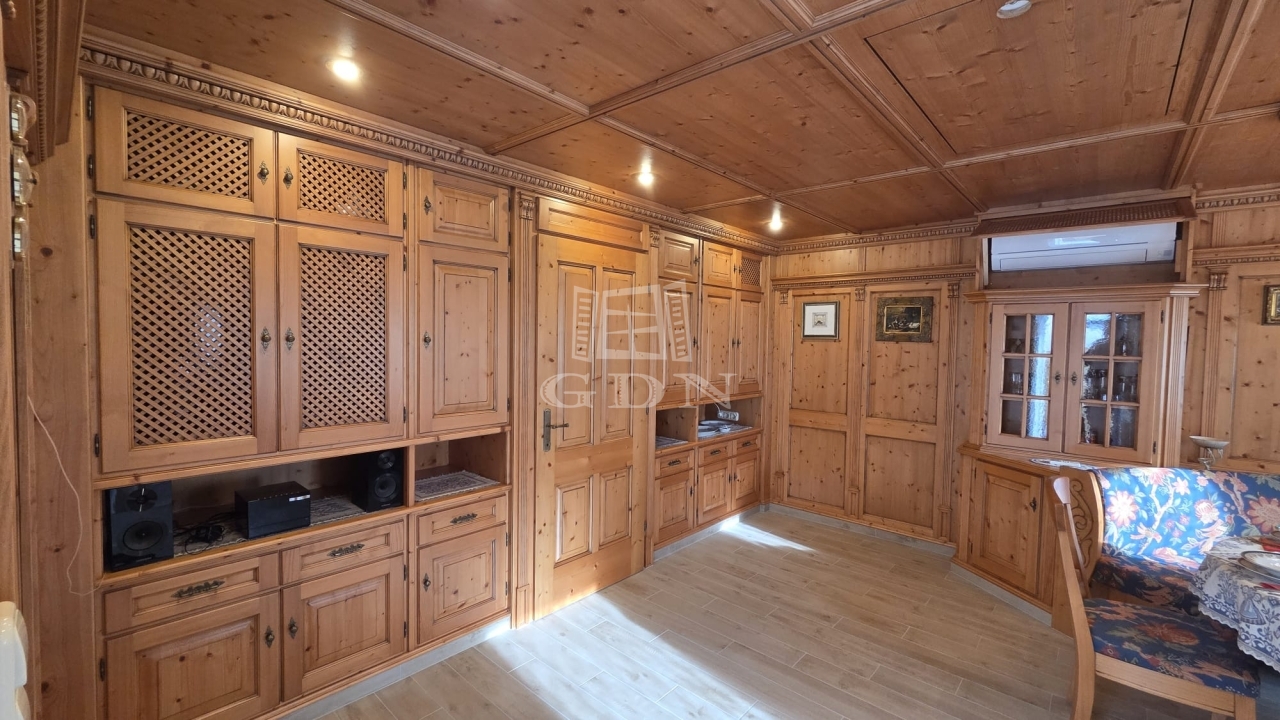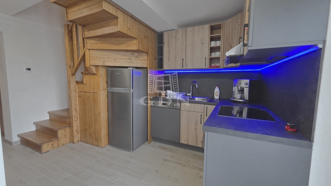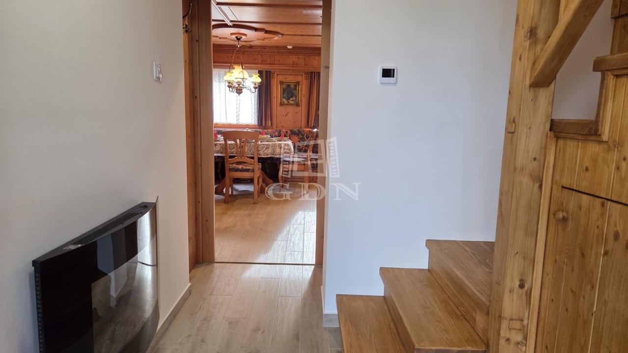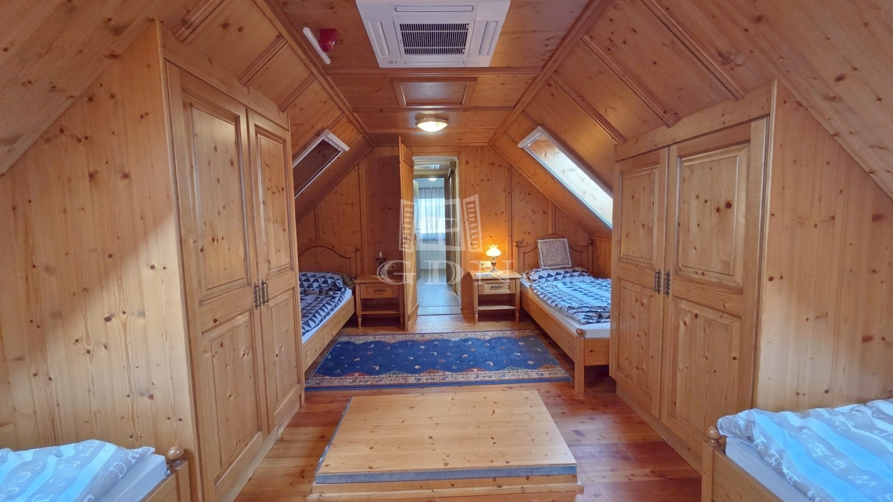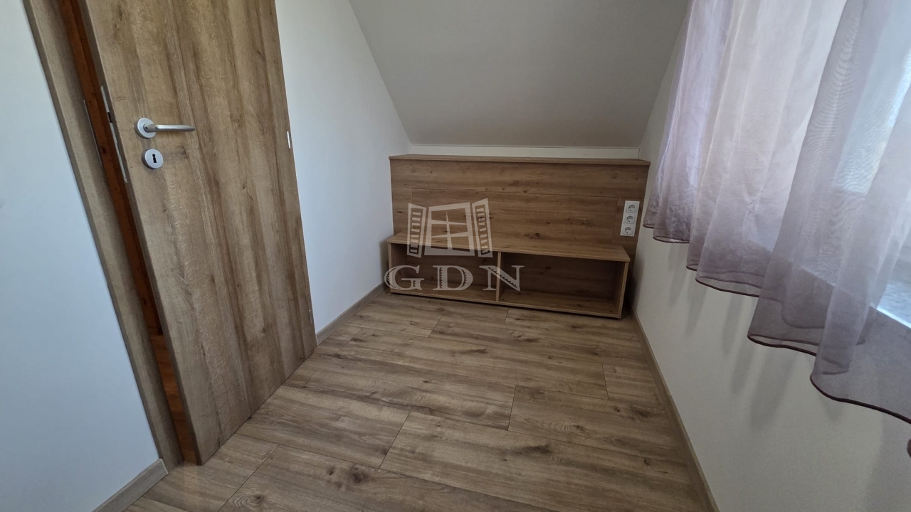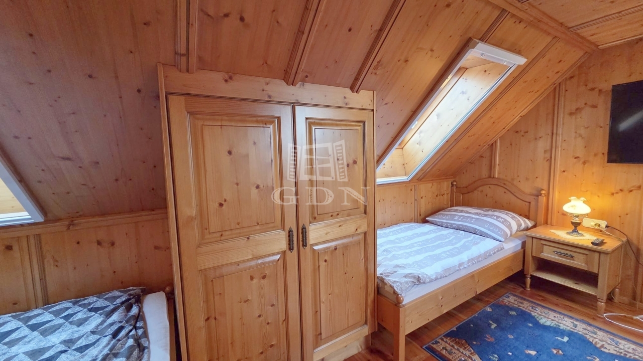 Az emeleten további két hálószoba és egy fürdőszoba található, így ideális vendégek vagy család számára is. A földszinti látszó fa gerendák meleg, természetes hangulatot teremtenek, amely harmonikusan illeszkedik a modern belső térhez.