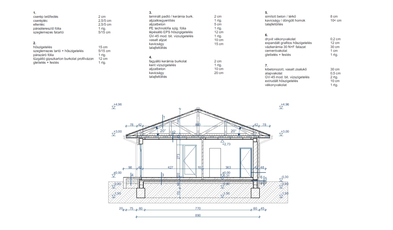Az épület Porotherm 30-as tégla falazattal, 14 cm-es grafitos homlokzati szigeteléssel és 30 cm vastag tetőszigeteléssel készül. A fűtést és a melegvizet 12 kW-os hőszivattyú biztosítja, a teljes ingatlanban padlófűtéssel, míg a hűtést oldalfali fancoil egységek látják el.