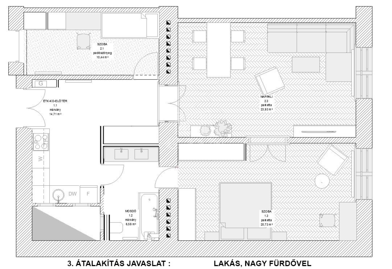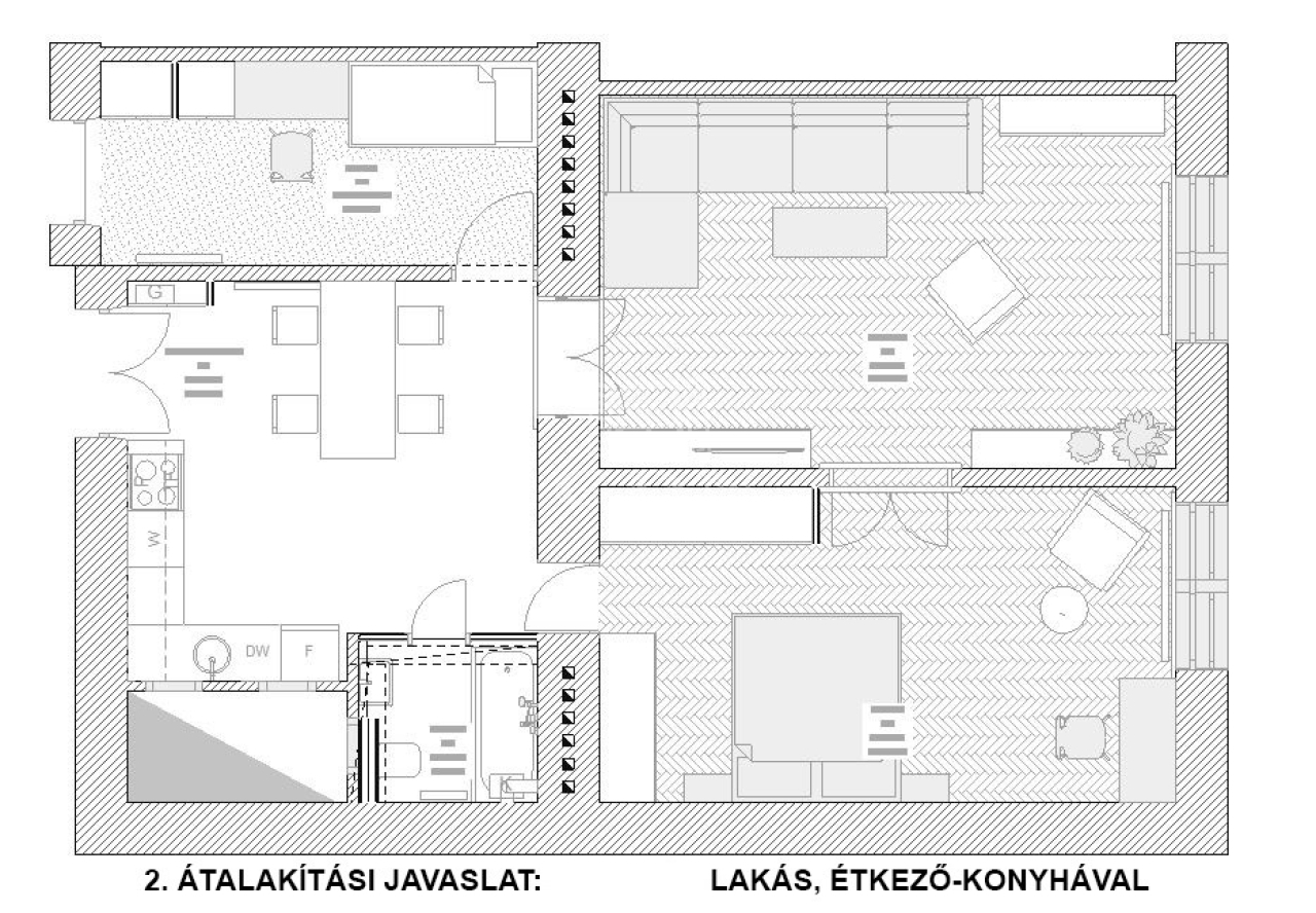 Igény esetén a két lakás könnyen egybe is nyitható, így egy 3 szobás, tágas lakást kapunk. Átalakításnál múszaki rész kiépített, nem igényel plusz munkát.