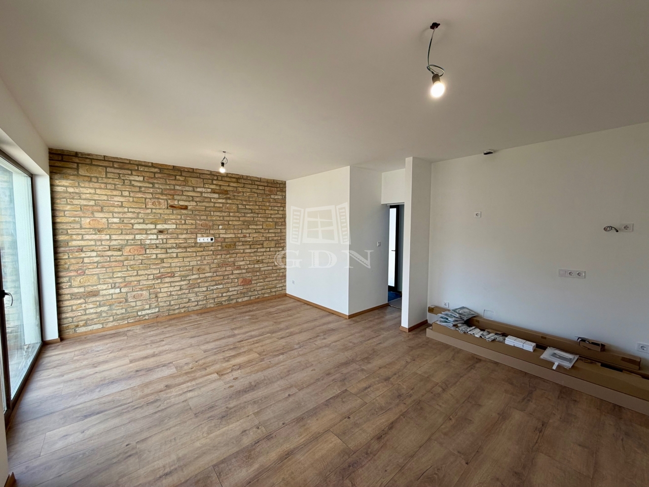Az alsó szinten egy tágas, napfényes amerikai konyhás nappali kapott helyet, közvetlen kijárattal a kb. 90 m²-es saját kertbe, valamint egy vendégmosdó és egy tároló.