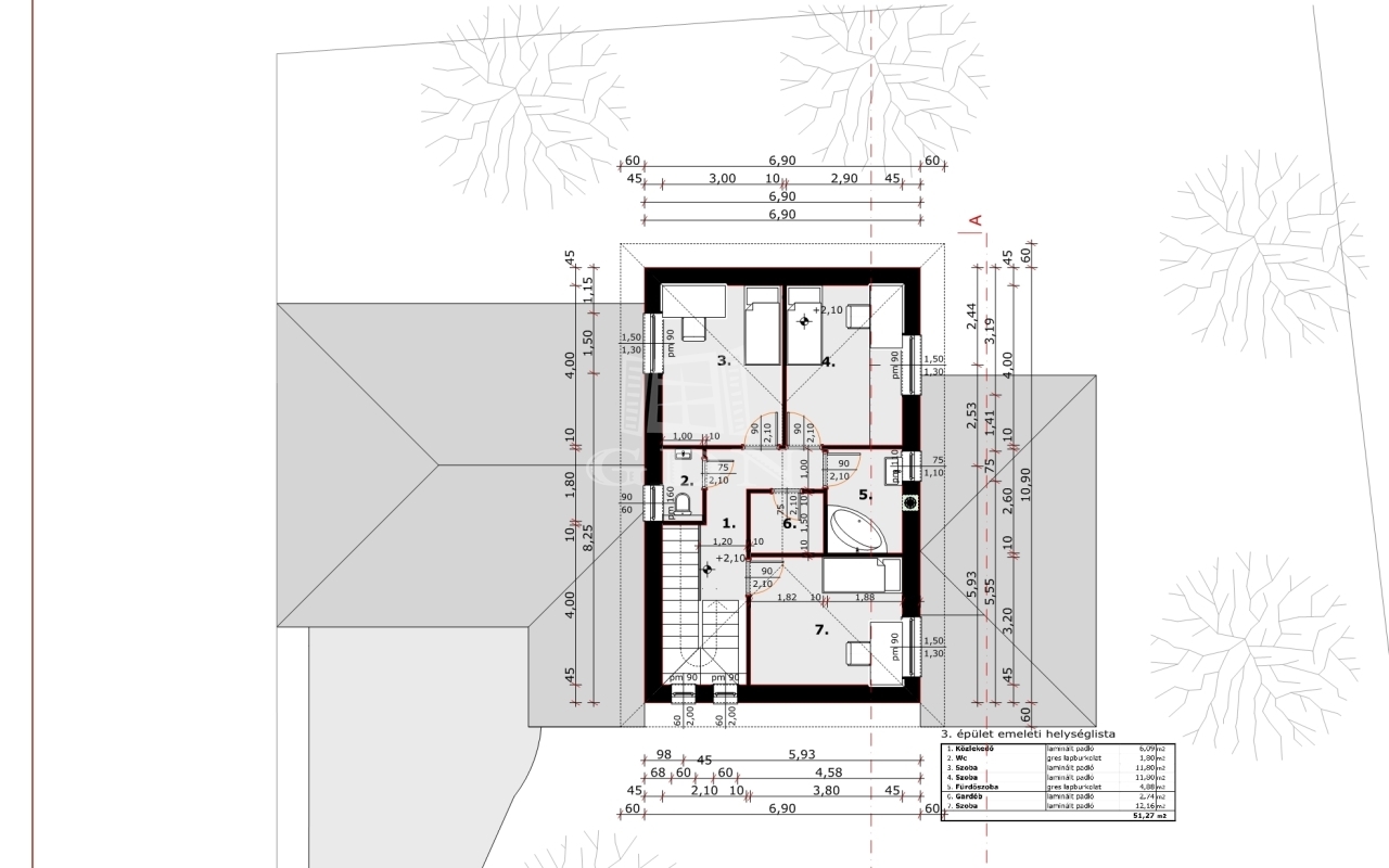o Emelet: közlekedő, 3 különálló hálószoba, gardrób, fürdőszoba, külön WC.