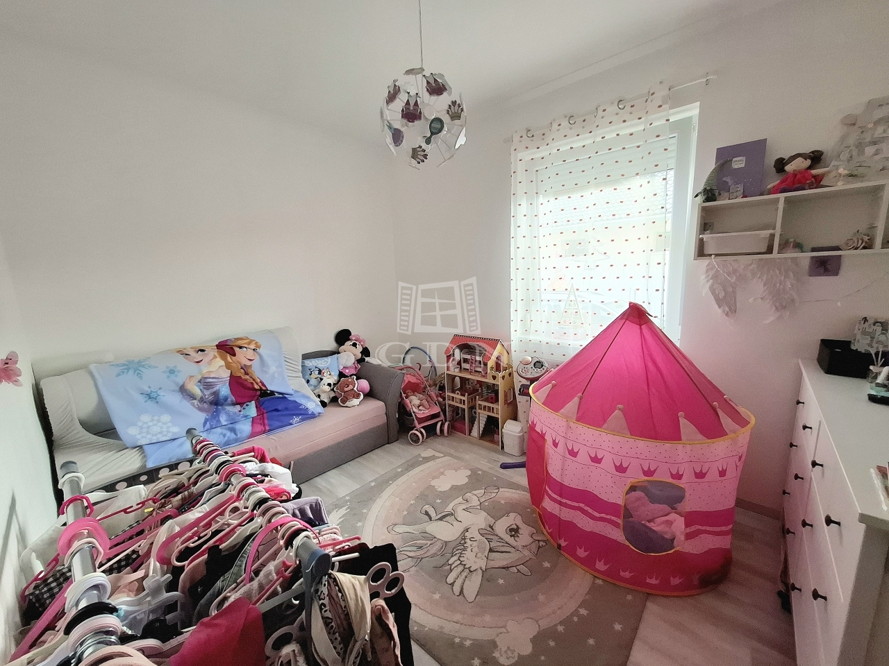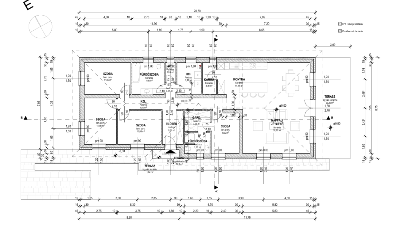 Helyiségei: Előtér 4,6 nm, amerikai konyhás nappali teraszkapcsolattal 51,9 nm (fedett terasz 25,5 nm), 4 lakószoba egyenként 9,3 nm, 10,5 nm, 10,5 nm, 10,9 nm, fürdőszoba káddal zuhannyal 7,2 nm, fürdőszoba zuhanyzóval 3,8 nm, mosókonyha 5,6 nm, gardrób 3,6 nm, közlekedő 11,1 nm, kamra 5,3 nm, wc 1.1 nm.