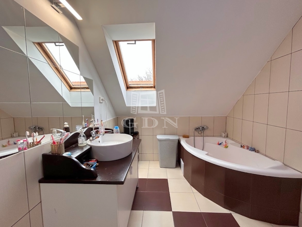 A kétszintes épület 30-as Porotherm téglából épült, beton födémmel, Bramac betoncserép héjalással. Homlokzatán 10 cm-es dryvit szigetelés, a tető alatt 30 cm kőzetgyapot szigetelés található. Az ingatlan elektromos hálózata 3×20 A erősségű. A telek 815 m2-es, összközműves, rajta fúrt kút, szaletli, dupla garázs, parkosított kertrész és térkövezett parkolók találhatók.