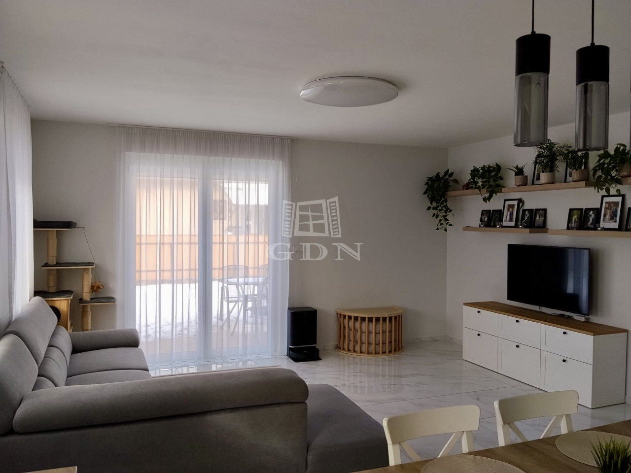 A ház nettó 95,49 négyzetméteres lakóterülettel rendelkezik, amelyet átgondolt, praktikus elrendezés jellemez. A tágas, amerikai konyhás nappali a lakás központi tere, amely természetes fényben gazdag, jól berendezhető, és közvetlen kapcsolatban áll a kerttel. A három külön nyíló szoba kényelmes életteret biztosít akár családok számára is. A konyha teljesen gépesített, a beépített bútorokkal és eszközökkel együtt a vételár részét képezi, ahogyan a fürdőszoba berendezése és a zuhanykabin is. A padlástér további praktikus tárolási lehetőséget kínál.