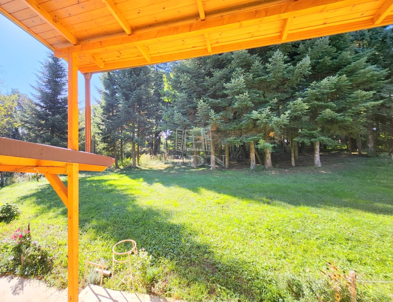 A két épületrészt egy, az egész ház előtt végigfutó, 30 m2-es fedett terasz köti össze, ahonnan csodálatos panoráma nyílik a házat körülölelő fenyőerdőre.