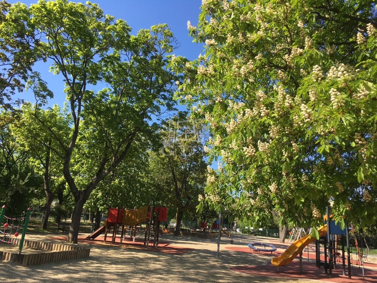 Közvetlen közelben park nagy játszótérrel és futókörrel.