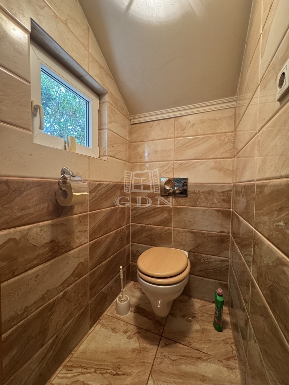 Belső fényképek a felső szint helyiségeiről nem készültek a tulajdonos kérésére. A közlekedő részben és a szobákban, nappaliban jó állapotú halszálkamintás parkettával, nagy ablakokkal. A fürdőszobában is eredeti burkolatok vannak, de jó állapotúak, kék színűek. Ezen a szinten a konyha nincs bebútorozva (jelenleg az alsó szinten található konyha van használatban), de a kiállások és a csempe megmaradt.