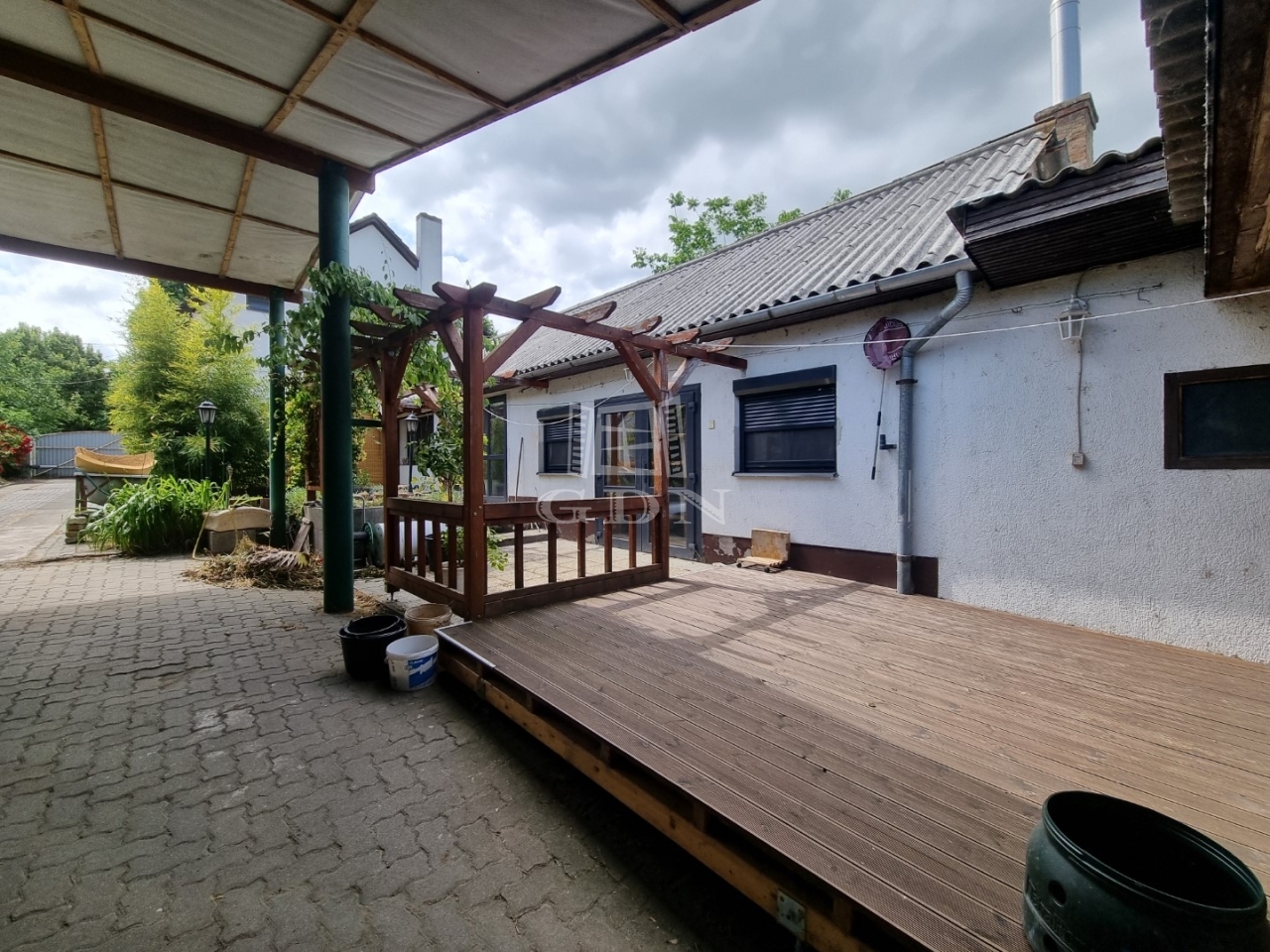 A kert kiválóan alkalmas pihenésre, illetve családi vagy baráti összejövetelek tartására. A telek hátsó része jelenleg nem művelt, veteményesnek, gyümölcsösnek kiváló, található itt egy fóliasátor is. A házhoz széles kapu, 2 állásos garázs, előtte nagyméretű kocsibeálló tartozik, mely több autó befogadására is alkalmas. A ház előtti rész rendezett.