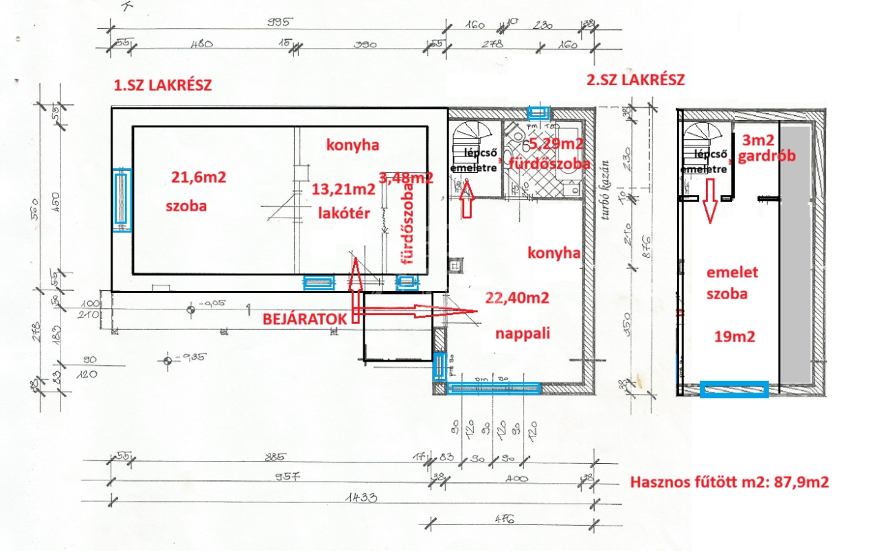 Jelenleg két külön lakrészre van bontva - kétgenerációs - igény szerint könnyedén össze is nyitható. Jól használható tároló és garázs is van