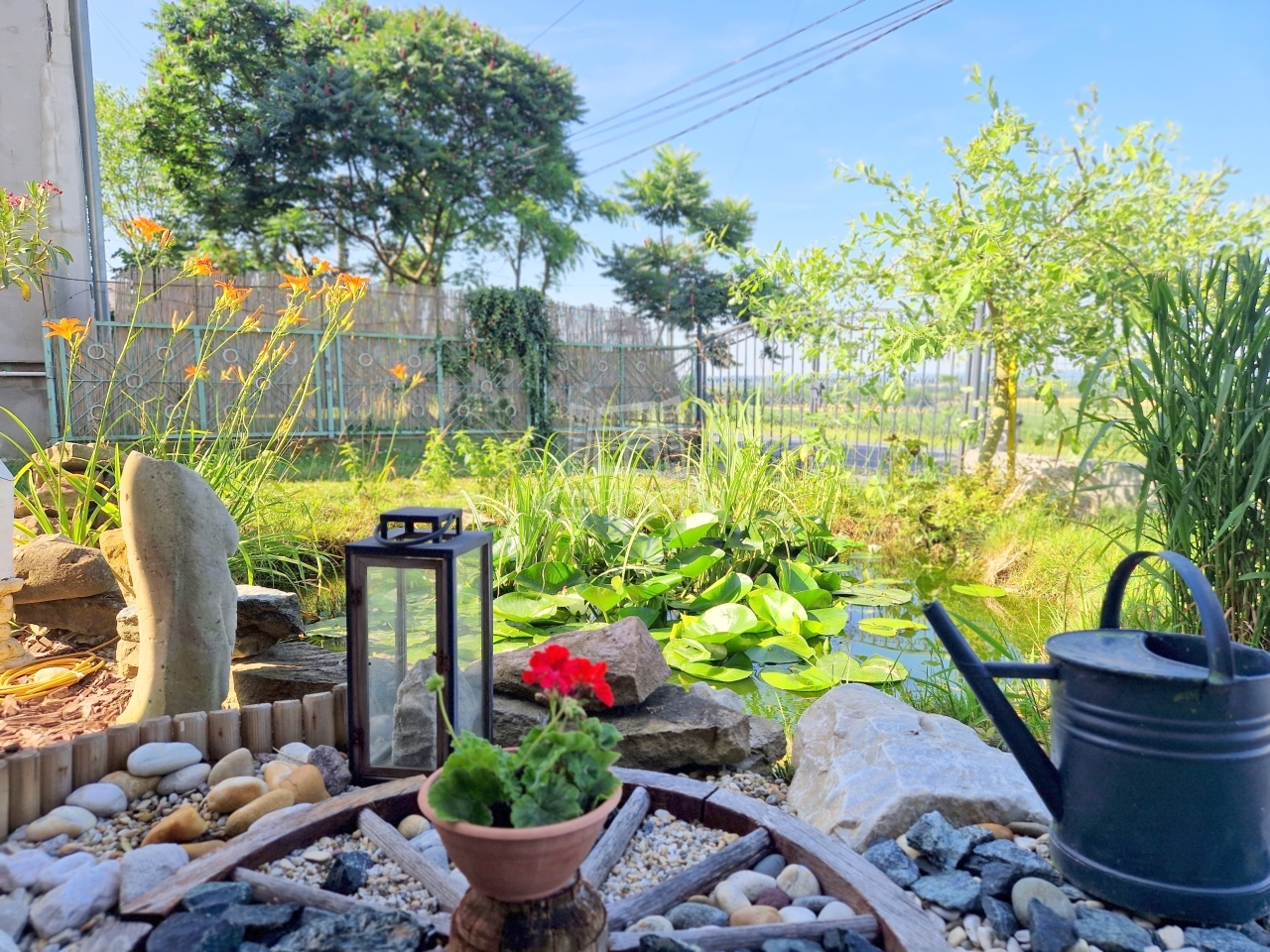 Az első udvar, melyen egy gyönyörűen kialakított, halakkal teli tó is található minden oldalról körbekerített, a hátsó "veteményes" udvarrész azonban nem igényelt körbekertelést.