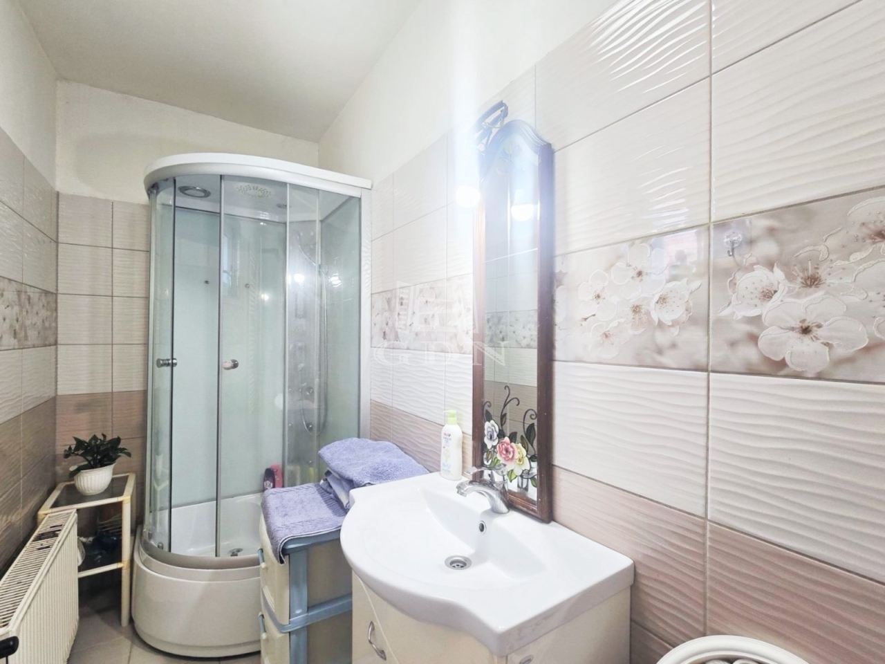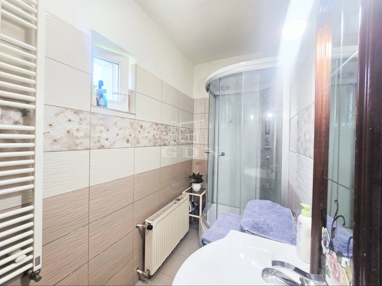 A fürdőszobában zuhanyzó került beépítésre, illetve egy külön helyiség lett kialakítva a mosókonyhának, ahol a mosó-és szárítógép és a melegvíz-ellátásért felelős villany-vízmelegítő is helyet kapott. Az ingatlanban a toalett külön helyiségben található.