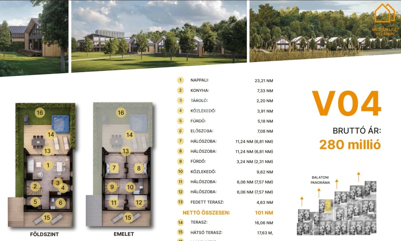 Levegős hőszivattyú (VRV splitklíma), 2,5 kW napelem rendszer, elektromos redőny, szúnyogháló, beépített bútorok, homlokzati díszvilágítás.