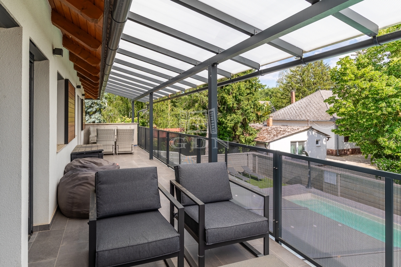 A telken kialakításra került egy 8x4 méteres távvezérléssel is fűthető, fedett, esti megvilágítással rendelkező medence, melyet térkövezett napozóterasz vesz körbe.