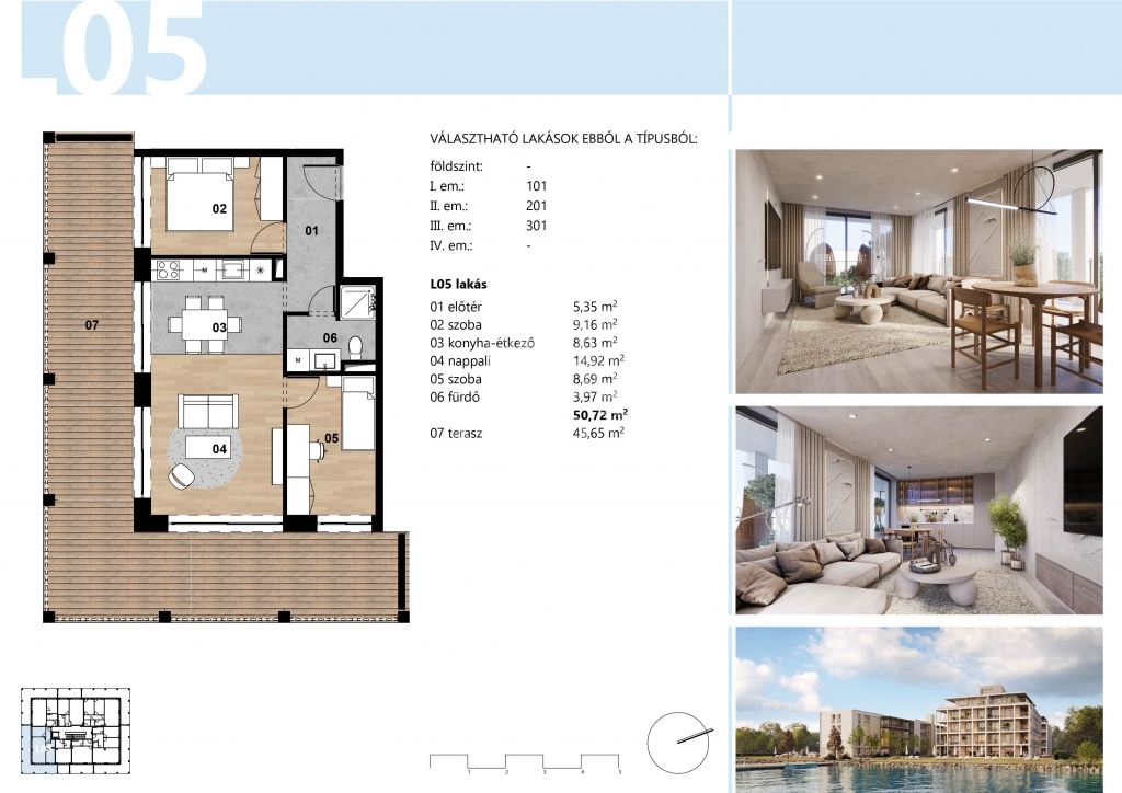 50 nm-es, 3 szobás, 45 nm-es terasszal, elismert szakmai háttérrel rendelkező tervezőiroda által megálmodott lakás, kulcsrakész, 2026.II.negyedévben történő átadással eladó.