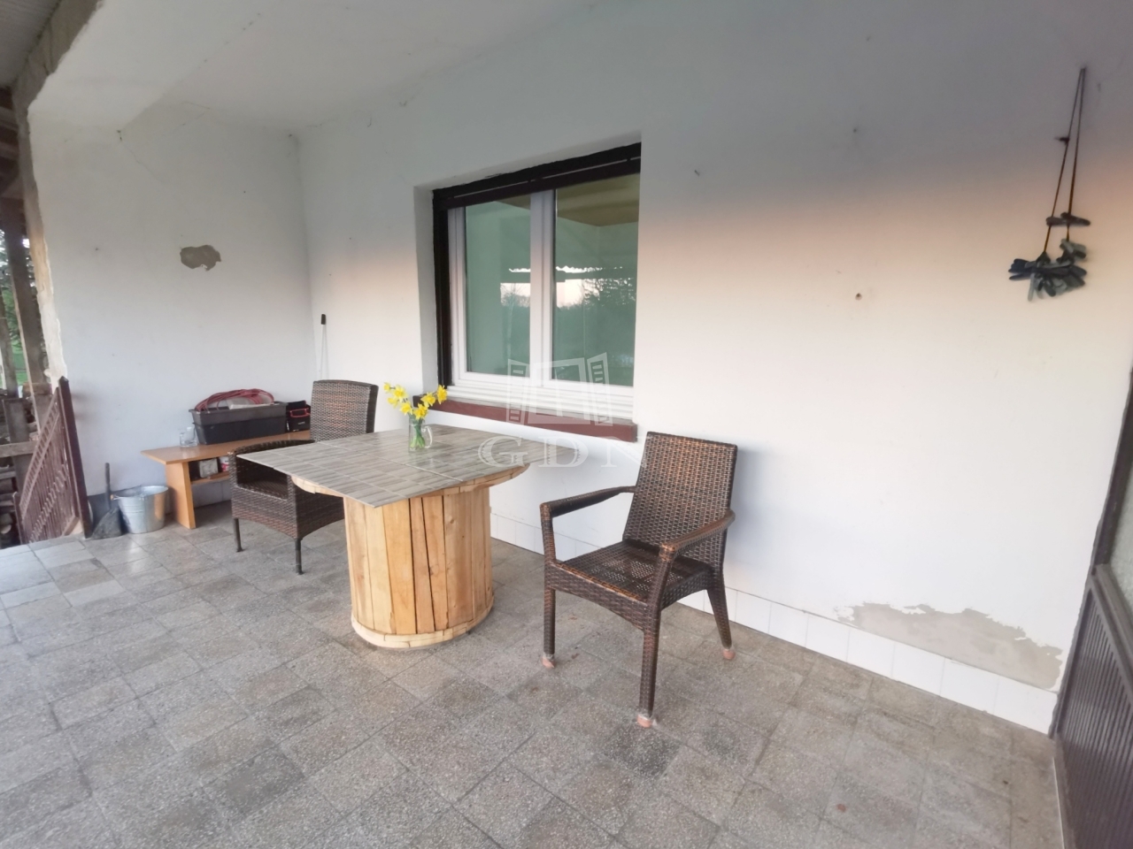 A ház praktikus elosztású, helyet kapott benne 3 szoba és egy nappali, amelyek kényelmes életteret biztosítanak egy család számára. A bejárat előtt egy nagy, fedett terasz található, amely tökéletes helyszíne lehet a pihenésnek, családi beszélgetéseknek vagy baráti összejöveteleknek.