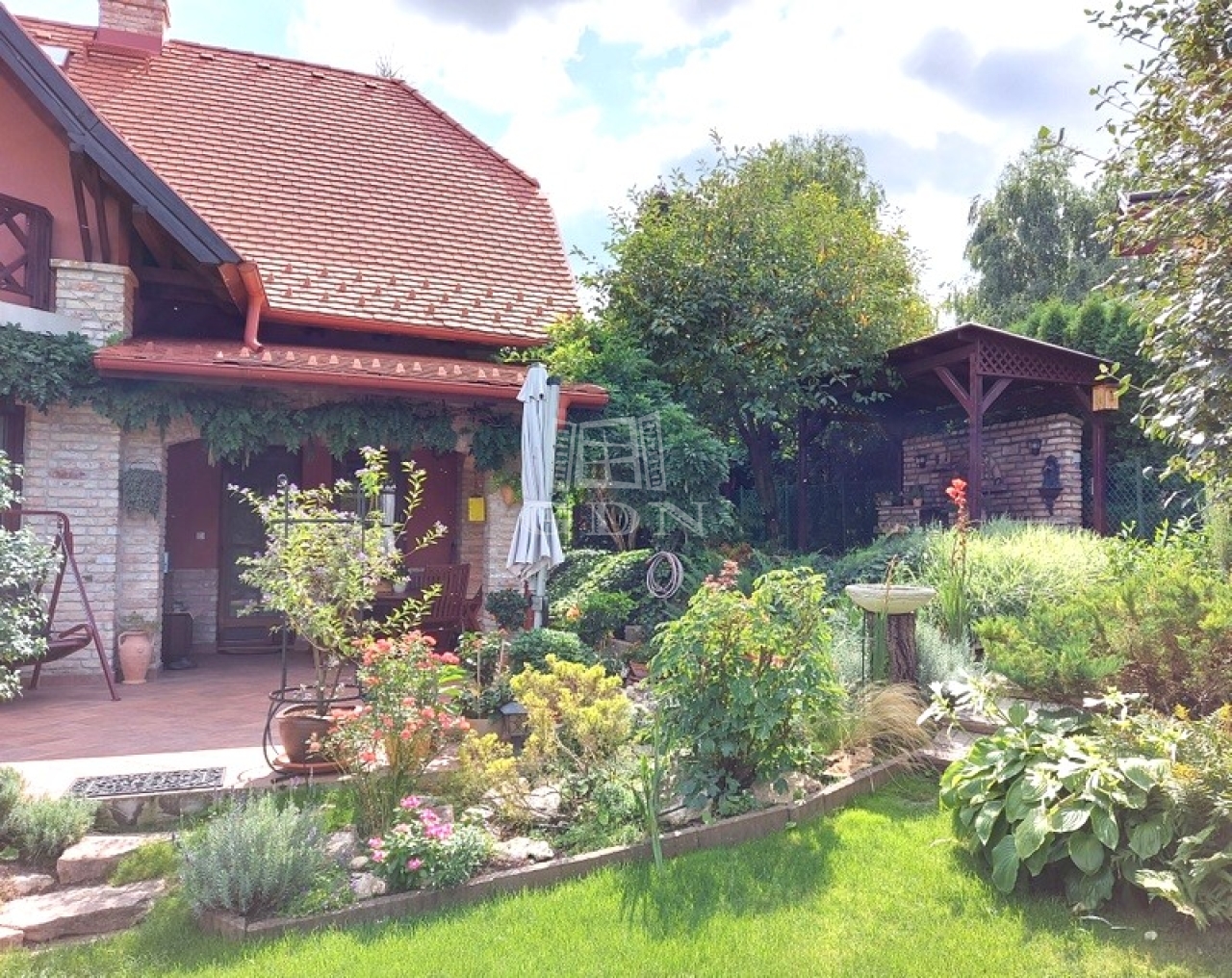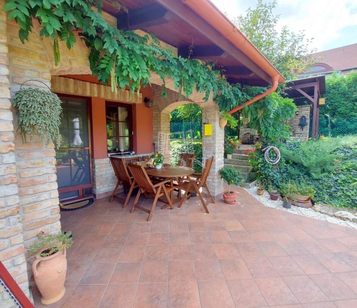 A gondozott kertet automata öntözőrendszer (4,8 m³-es ciszternával) tartja frissen. A társasági élet központja a bontott téglából és gránit munkalappal készült, fedett kerti konyha és grillező. Az autók számára fedett beálló biztosított.