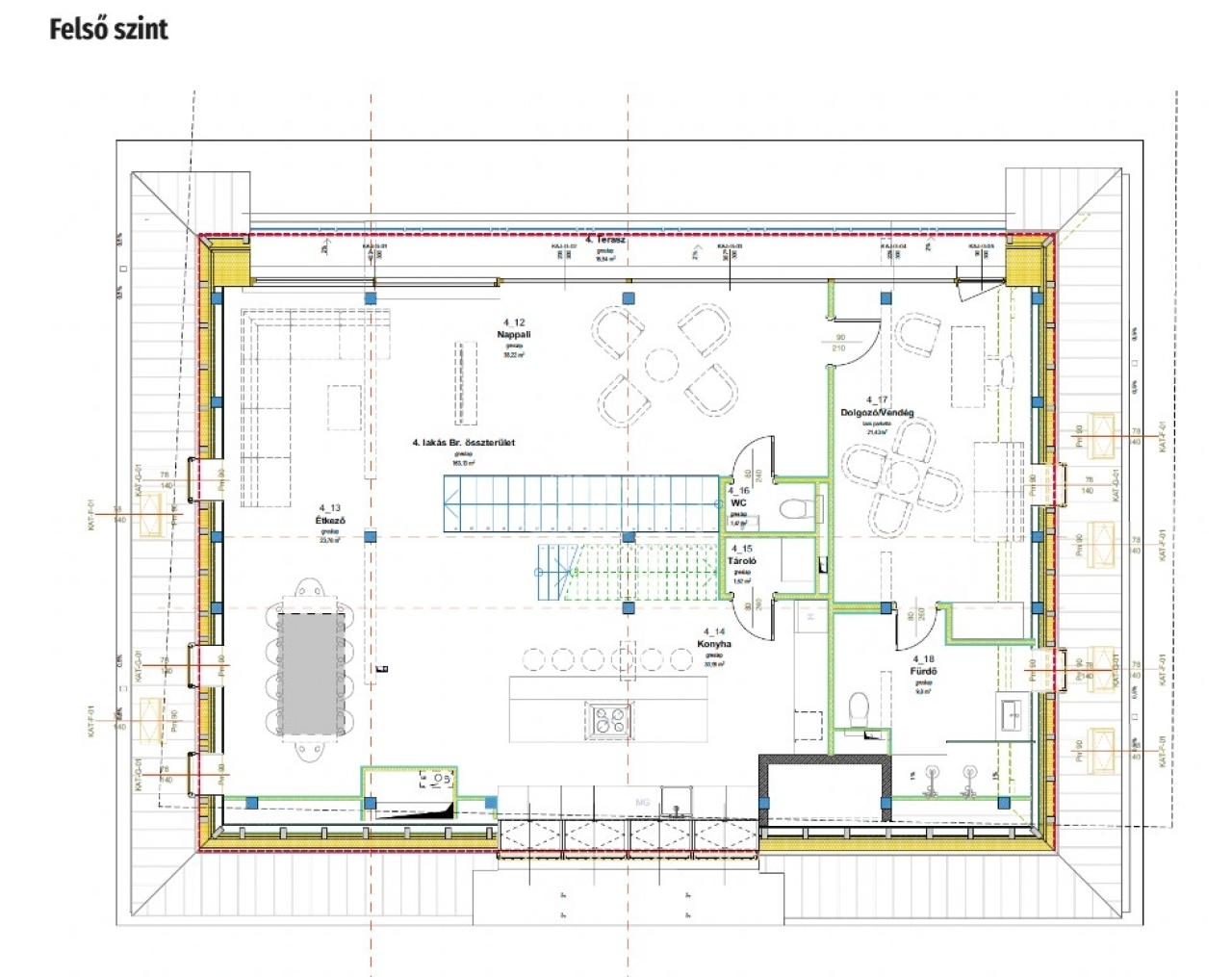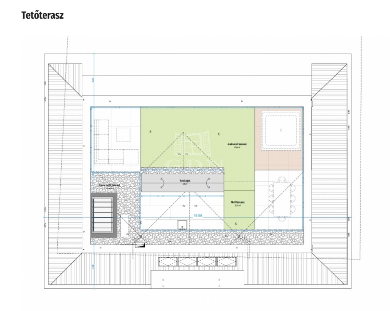 ⚙️ TETŐTERASZ – A lakás 133 nm-es tetőterasza privát oázis a város felett – automata ajtón keresztül kapcsolódik a lakótérhez.
