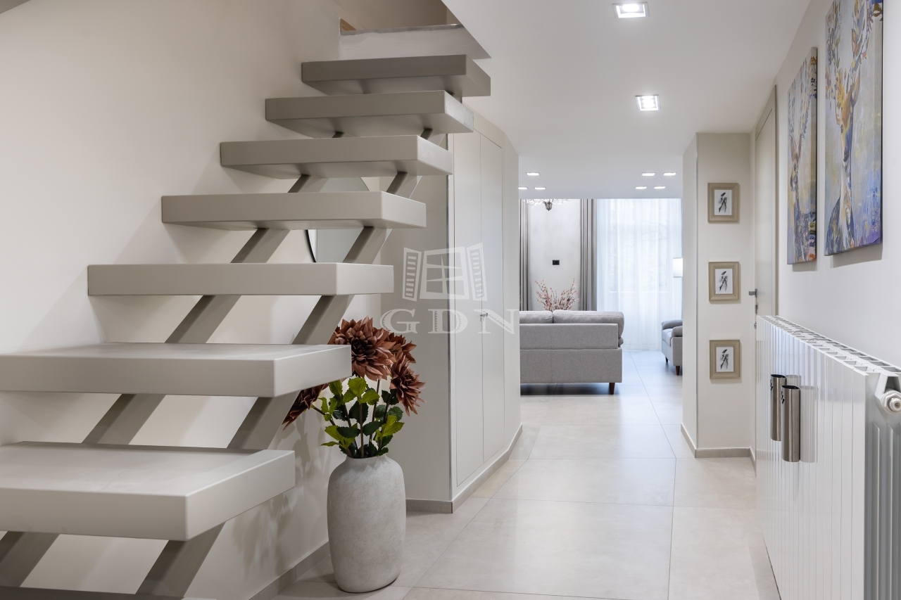 A modern, gépesített konyha egyedi, prémium minőségű olasz bútorokkal készült, emellett a lakásban több beépített szekrény is helyet kapott, így a tárolás kényelmesen megoldott. A komfortérzetet tovább növeli a klímaberendezés, valamint a falba süllyesztett széf.