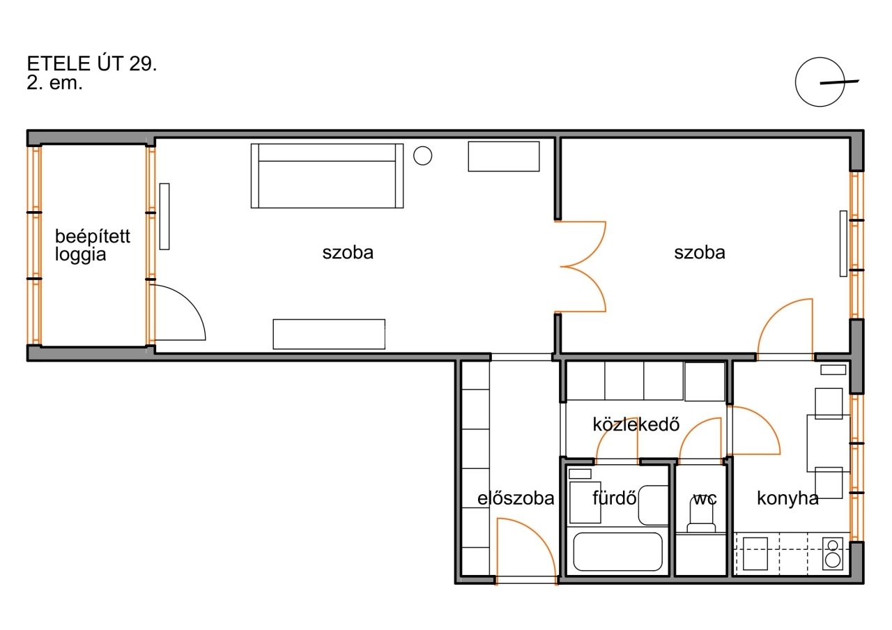 A lakás a második emeleten helyezkedik el, világos és jól átszellőztethető. Déli oldalon az Etele úttal párhuzamos zöld sávra, északi irányban a ház mögötti parkolóra és játszótérre néz.