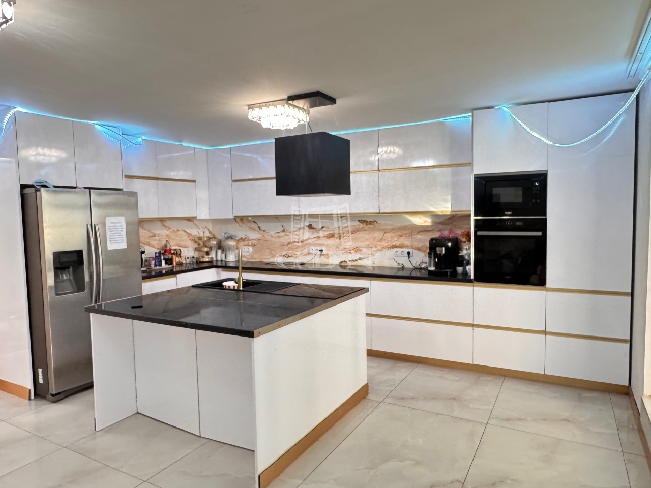 A házba belépve egy tágas nappaliba érkezünk, innen tovább haladva található egy étkezős - konyha, beépített modern konyhabútorral.