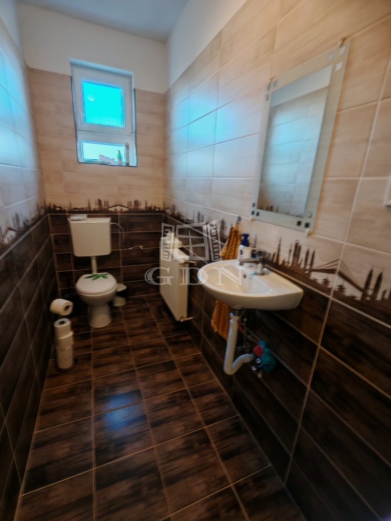 FÖLDSZINT – 4 szoba + konyha + kamra + óriási fürdő + wc , nagyon nagy előtér a vállalkozás miatt.