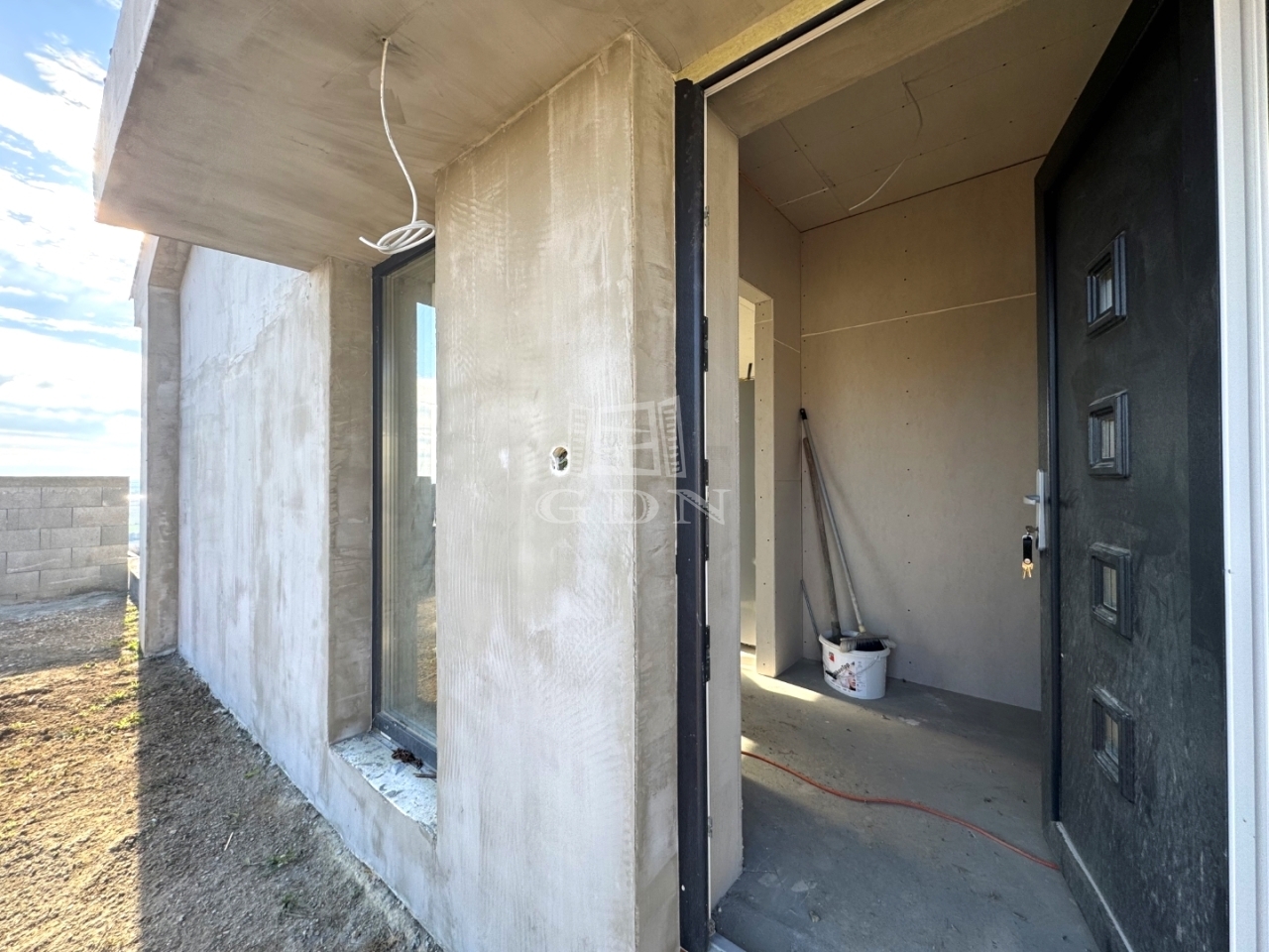 A 1100 négyzetméteres telek körbekerített, a bejutás kényelmét elektromos kapu garantálja. A terepviszonyok kiegyenlítése céljából masszív vasbeton támfal épült.