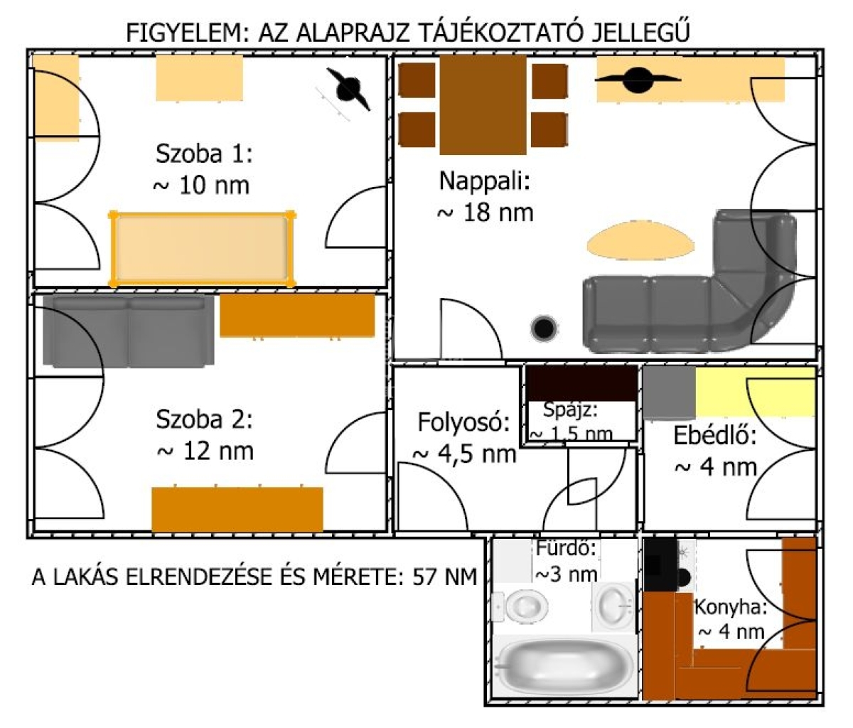 - Helyiségei: nappali+ 2 szoba, konyha + étkező, fürdőszoba + WC, folyosó, spájz.