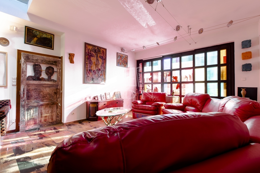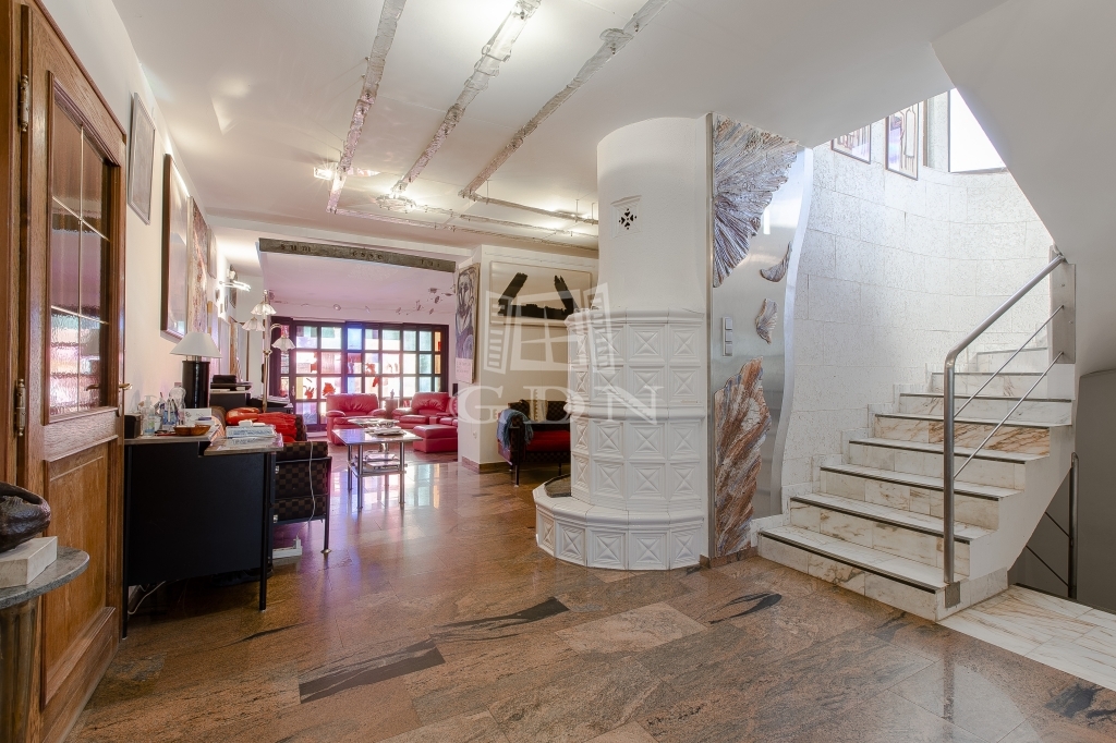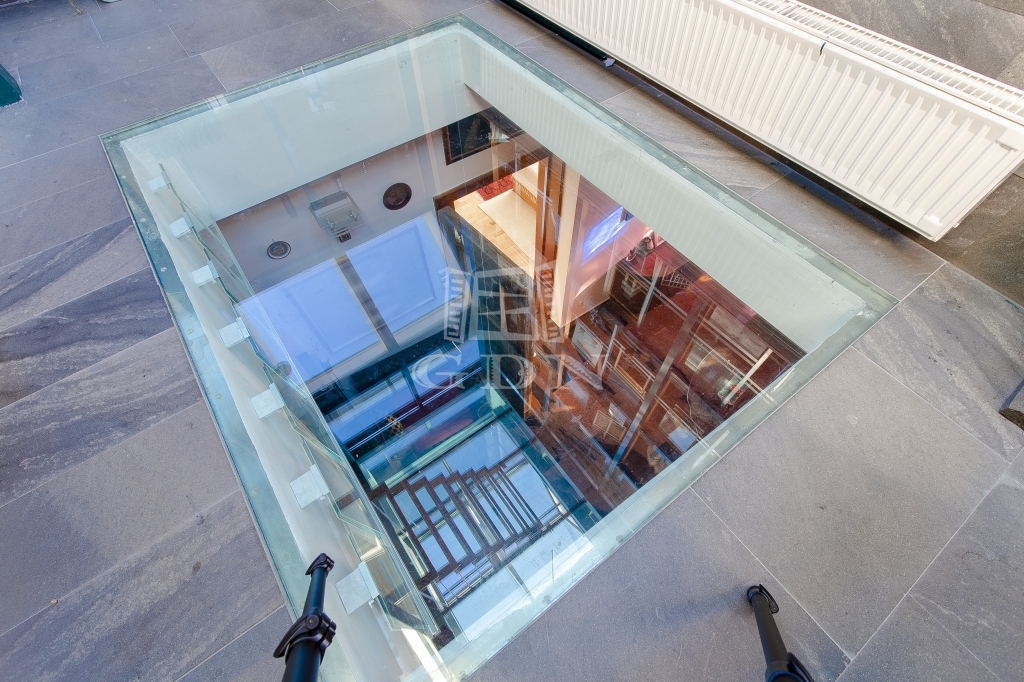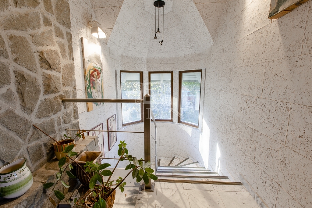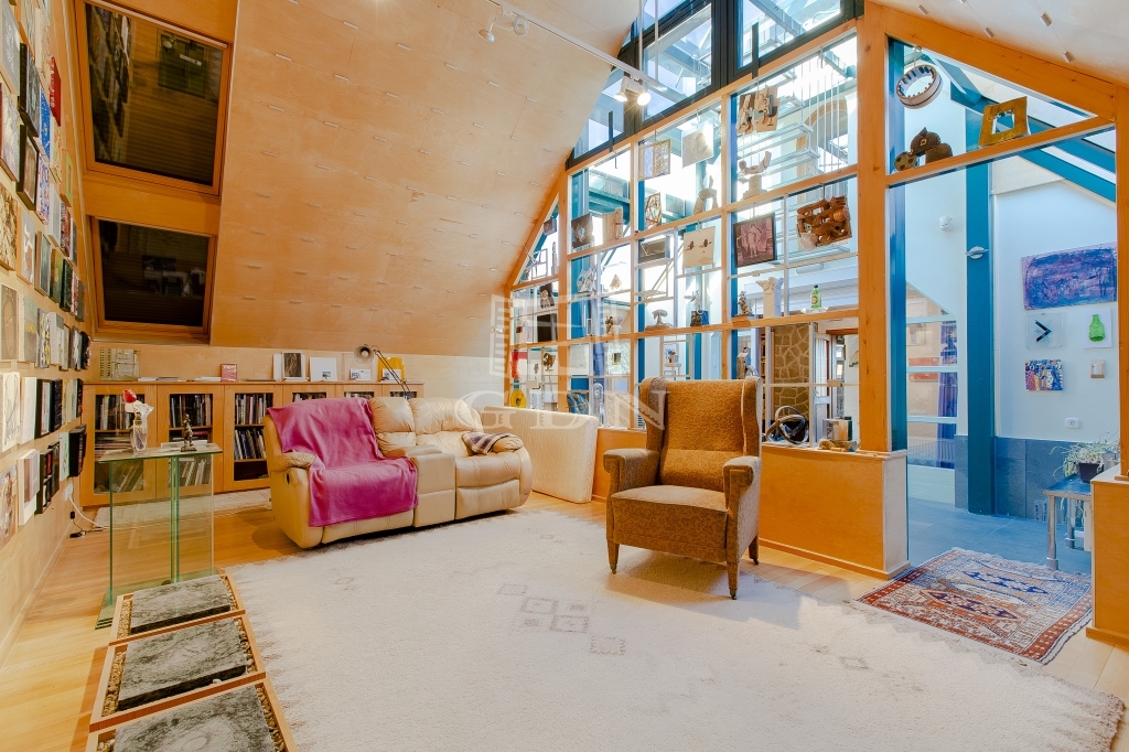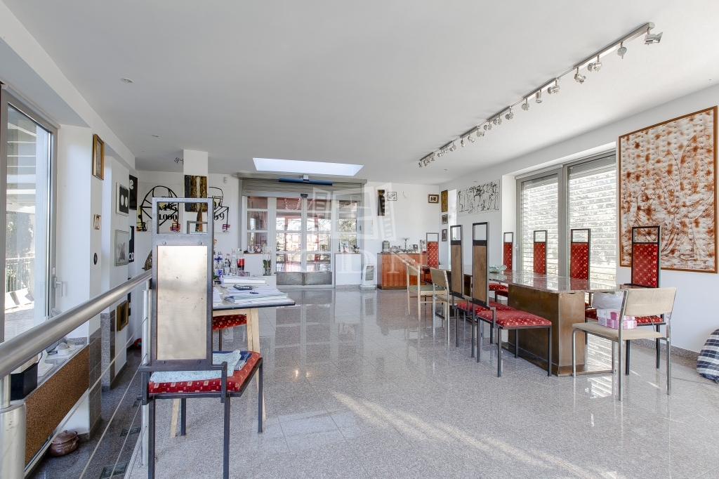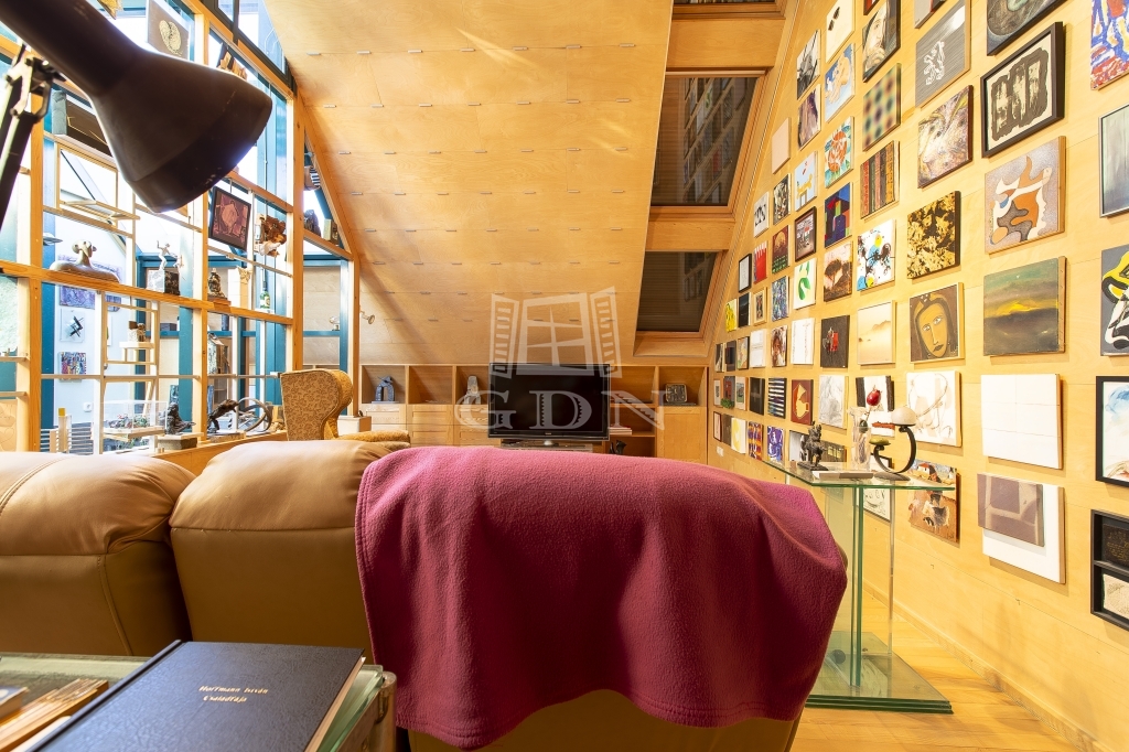 A fehérmárvánnyal burkolt lépcsőházon keresztül jutunk fel az emeletre. Itt megvalósult egy hálószoba – közvetlen 70 nm-es PANORÁMÁS TERASZ kapcsolattal – dolgozó szoba, fürdőszoba, illetve egy átriumos koncert szoba, melyet tulajdonos a gyűjteményeinek szentelt.