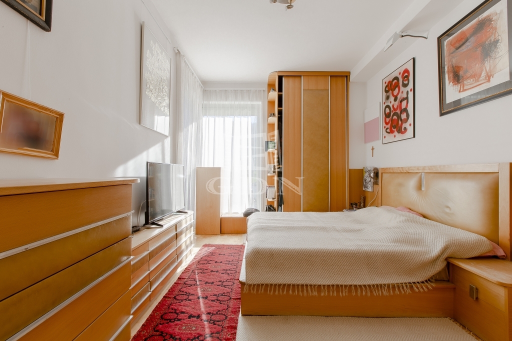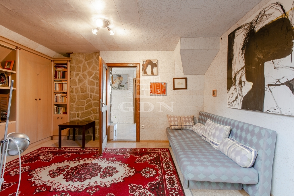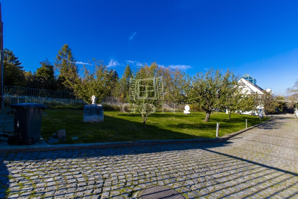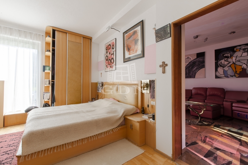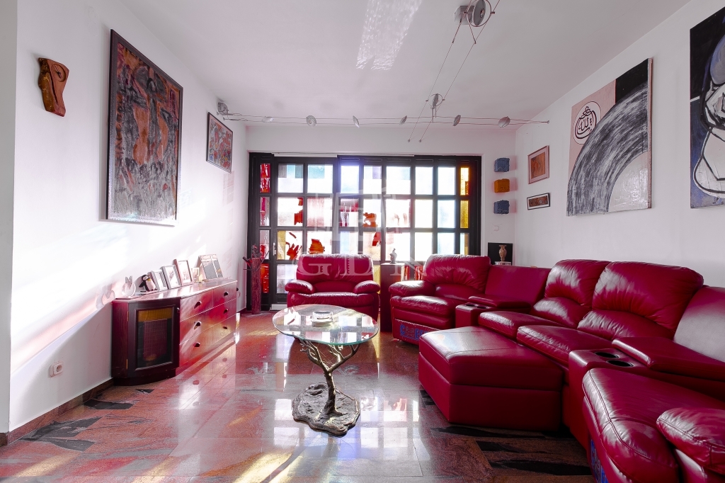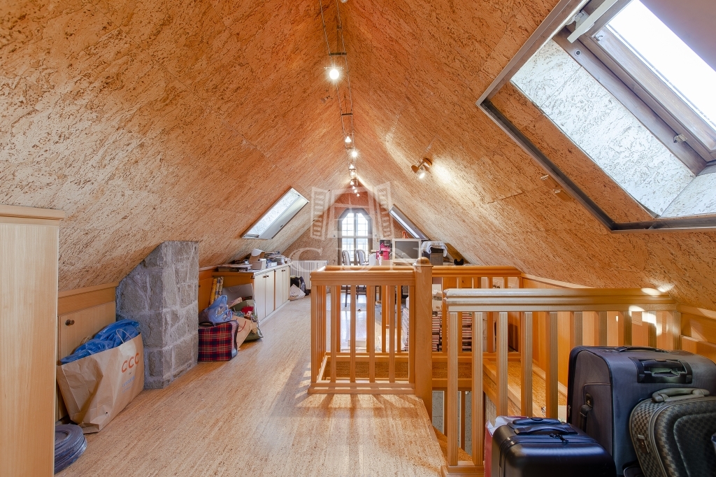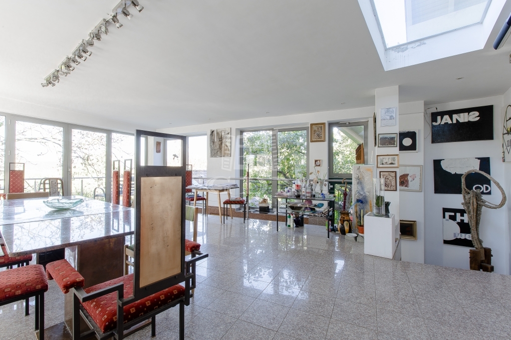 A fehérmárvánnyal burkolt lépcsőházon keresztül jutunk fel az emeletre. Itt megvalósult egy hálószoba – közvetlen 70 nm-es PANORÁMÁS TERASZ kapcsolattal – dolgozó szoba, fürdőszoba, illetve egy átriumos koncert szoba, melyet tulajdonos a gyűjteményeinek szentelt.