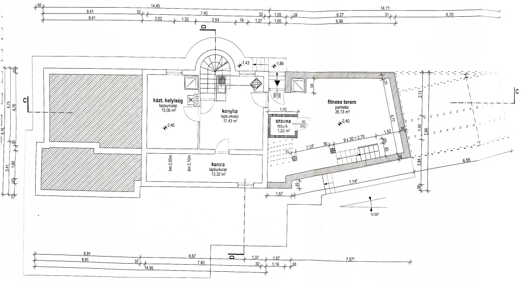 A pinceszinten - mely a télikertből megközelíthető – kialakításra került egy fitneszterem, szaunával, háztartási helyiséggel, konyhával, kamrával.