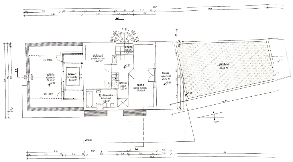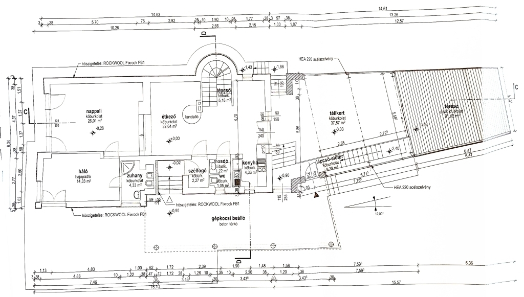 A földszinten kapott helyet egy VÖRÖS MÁRVÁNNYAL burkolt nappali, étkező, hálószoba, főzőfülke, télikert, illetve a főbejárat egy vendég wc-vel. Közvetlen kapcsolat nyílik a télikertből a kényelmes, részben panorámás teraszra.