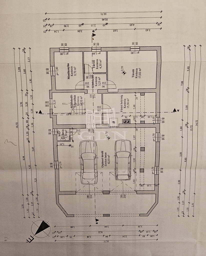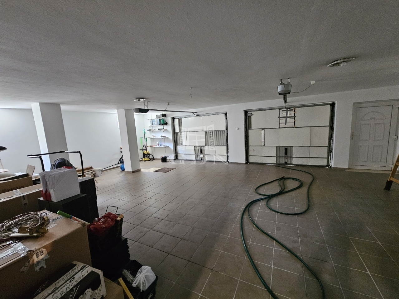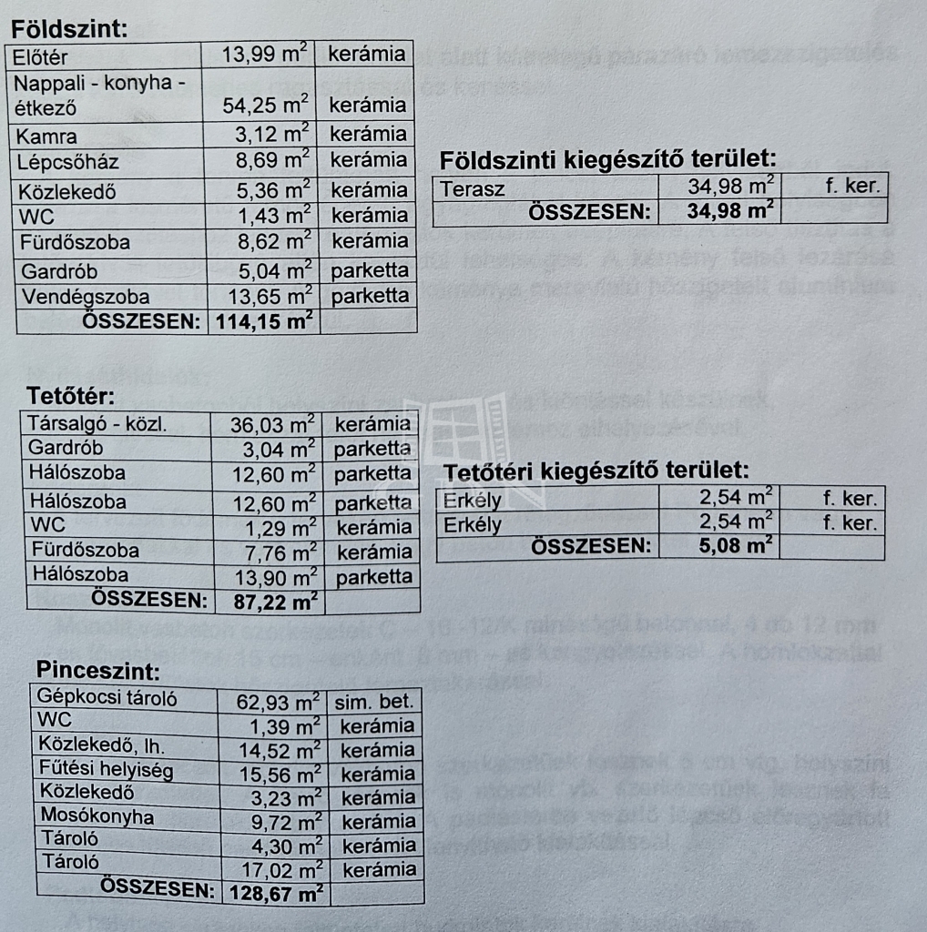 Az alsó szinten (128 m2), 3 autó számára alkalmas garázs, mosókonyha, 3 tároló, gépészeti helyiség található.