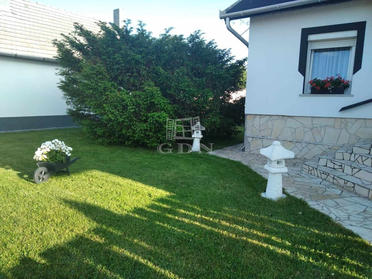 Az ingatlan riasztórendszerrel ellátott, a kert igényesen kialakított, az öntözést fúrt kút biztosítja. Itt kapott még helyet egy fedett kerti kiülő, szaletli és kerti sütögető is.