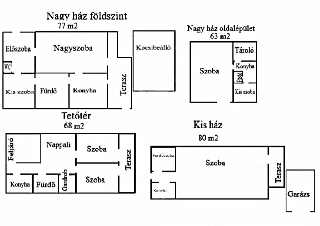 A nagyobb ház földszintje 77 nm-s, nappali, szoba, konyha és fürdőszoba, az emelet 68 nm-s, nappali, két szoba, konyha és fürdőszoba. Hozzá építettek még egy szobát, ahonnan nyílik a nagy ház alatti alagsori szint, kazánházzal és tárolókkal.