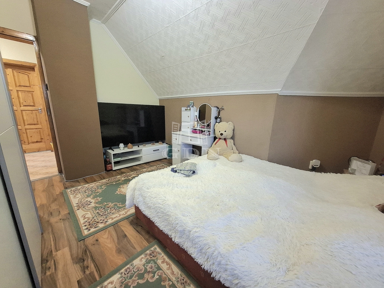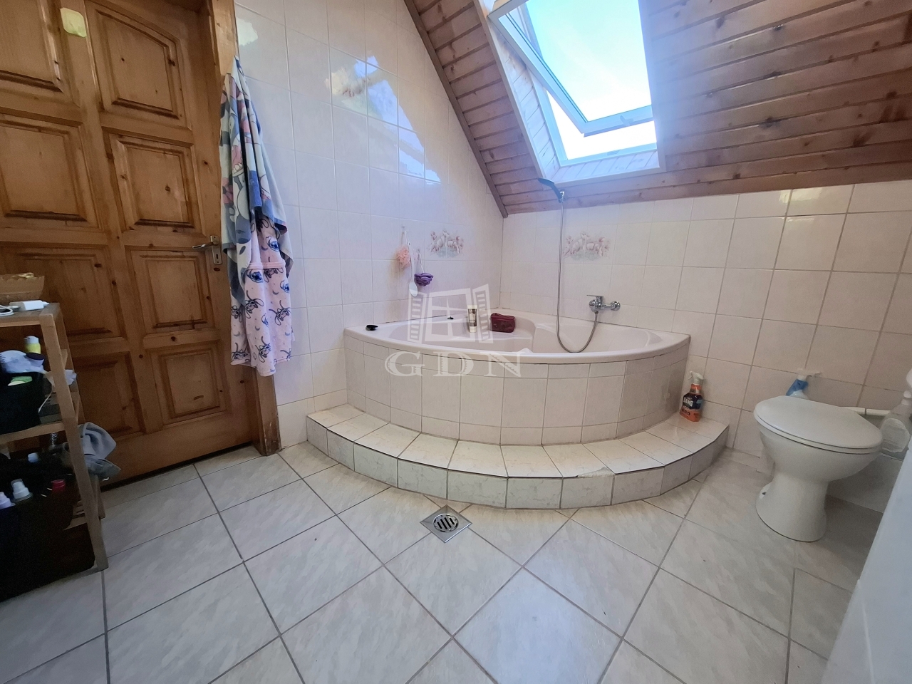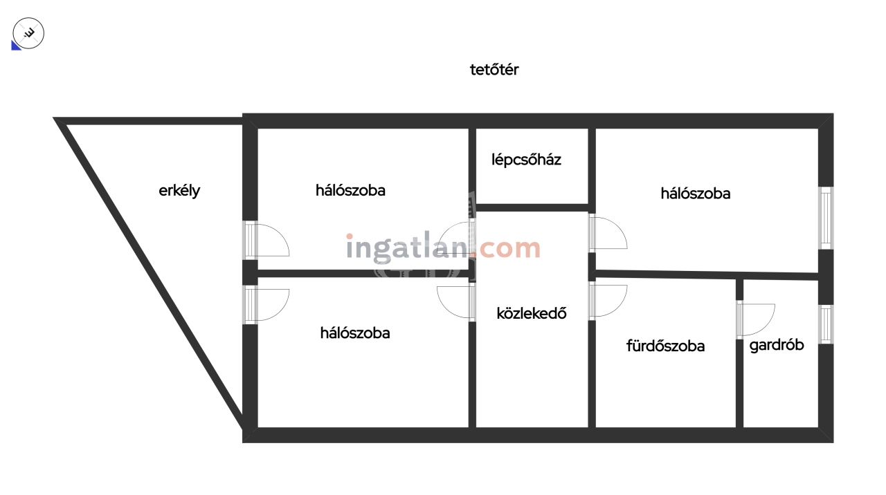 tetőtérben: három külön bejáratú hálószoba ebből kettő erkélyes, fürdőszoba sarokkáddal, gardrób, közlekedő dolgozó sarokkal.