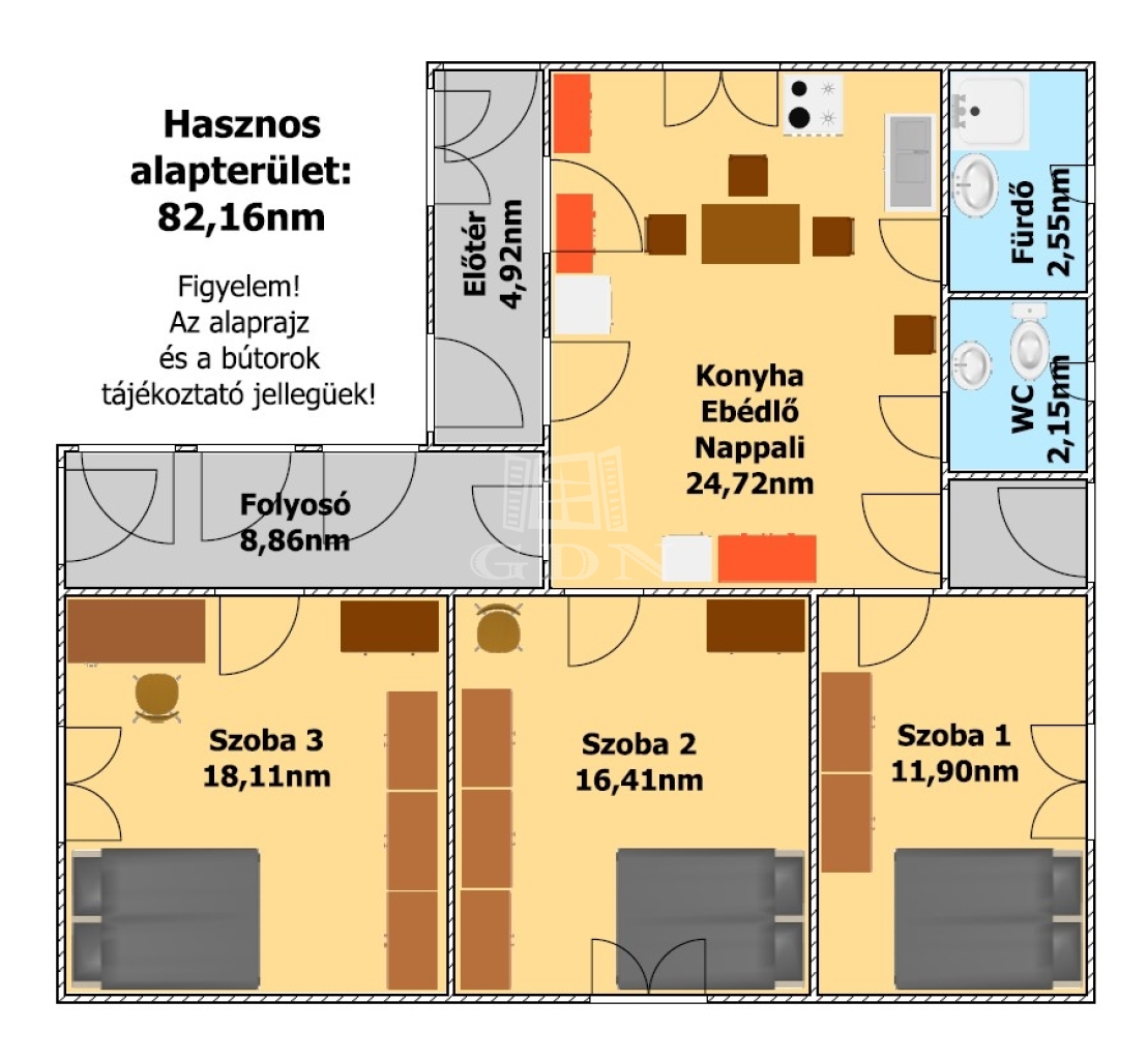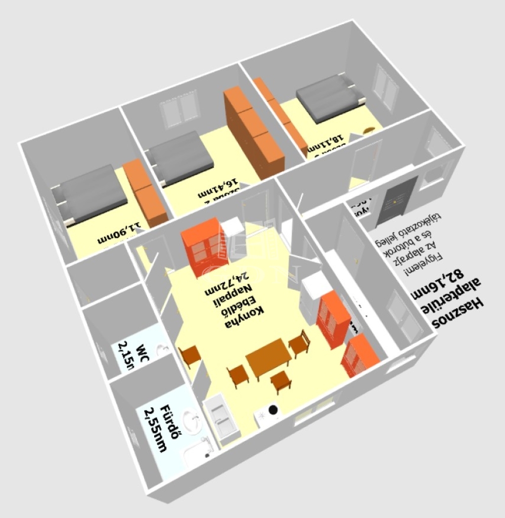 A főépület hasznos alapterülete 82,16nm melyben található: