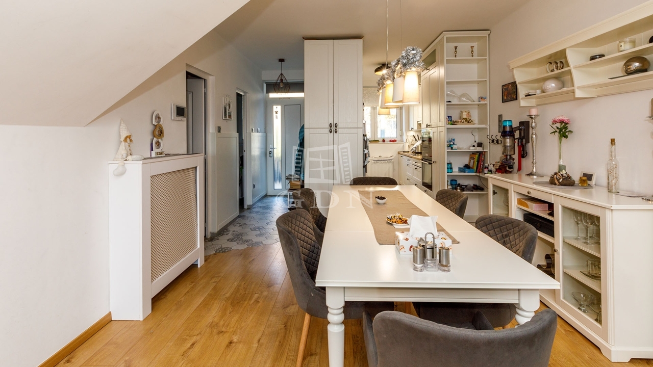 Ez a téglaépítésű ingatlan több szinten kínál tágas életteret, gondosan megtervezett belső terekkel. A földszinten egy szoba, konyha, tároló és fürdőszoba került kialakításra míg a többi három szinten további öt szoba, egy nappali egy konyha és két fürdőszoba áll rendelkezésre. A házhoz egy kertre néző erkély is tartozik az első szinten. Az autók elhelyezése garázsban és a ház előtt lehetséges.