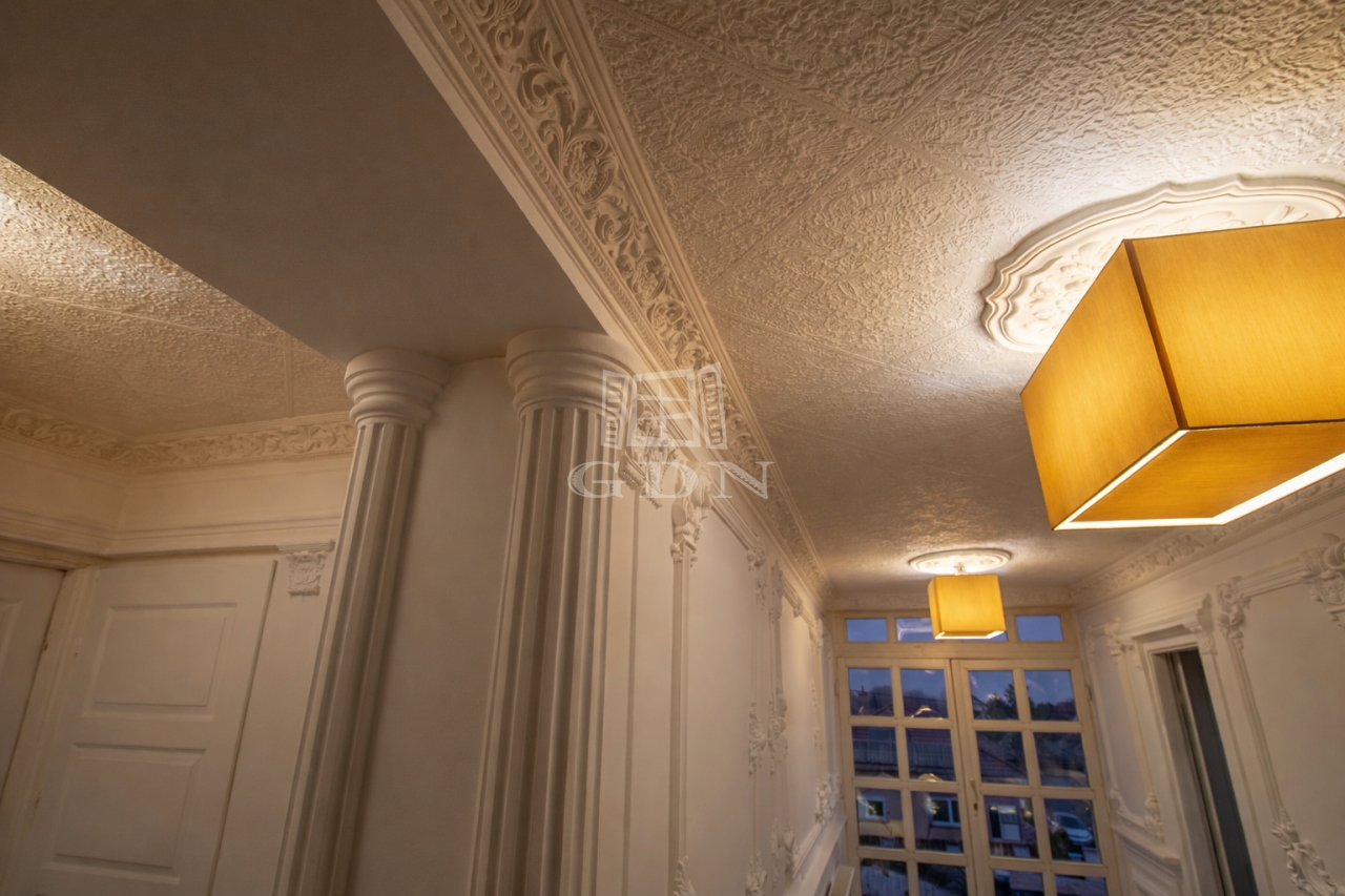 Az ingatlan belső és külső tereit eredeti, kézzel kidolgozott gipszstukkók, klasszikus oszlopos megoldások és íves nyílászárók teszik különlegessé, amely valódi villa megjelenést biztosít.