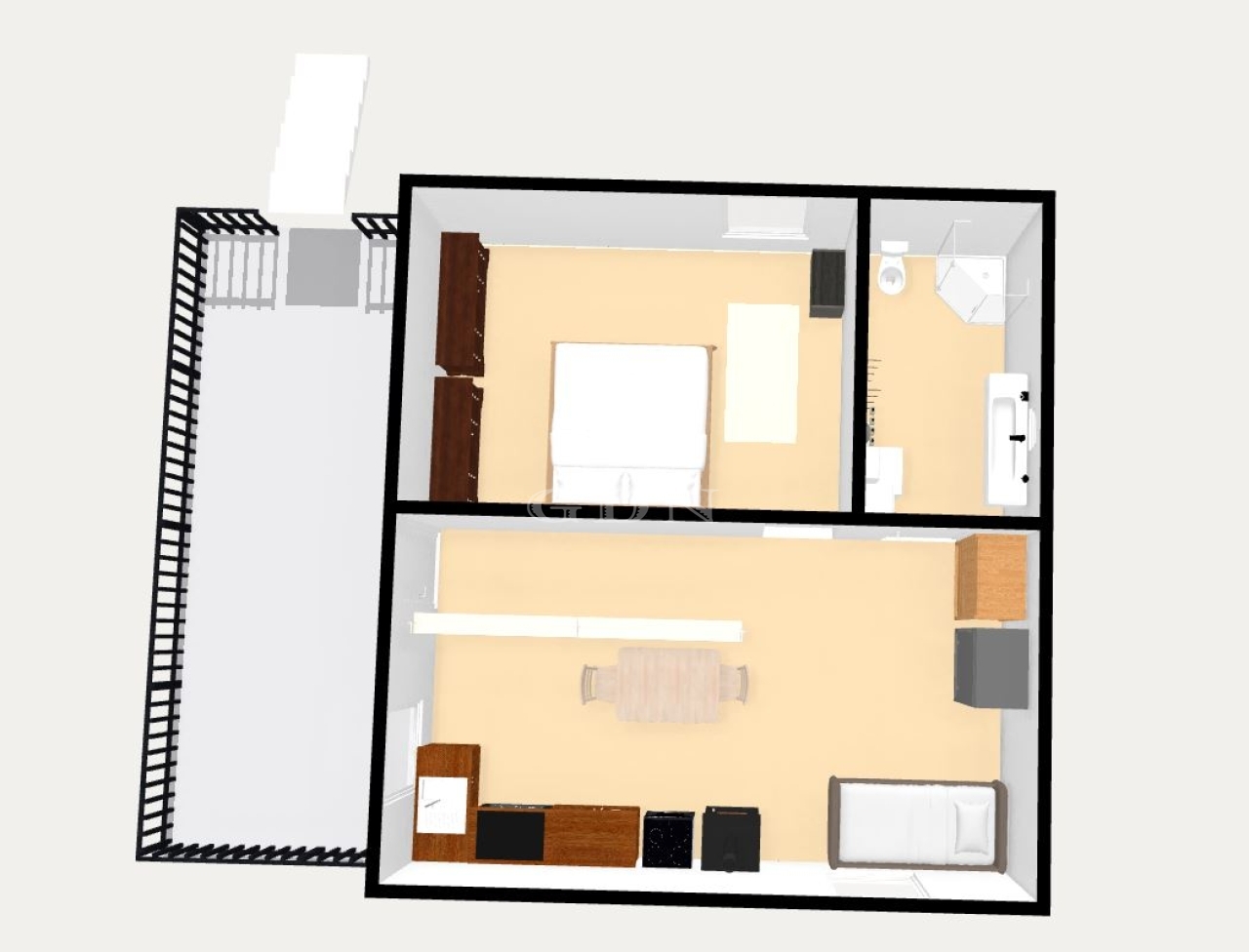 A lakáshoz tartozik egy 19 négyzetméteres terasz, ahonnan gyönyörű kilátás nyílik a környező kertre.