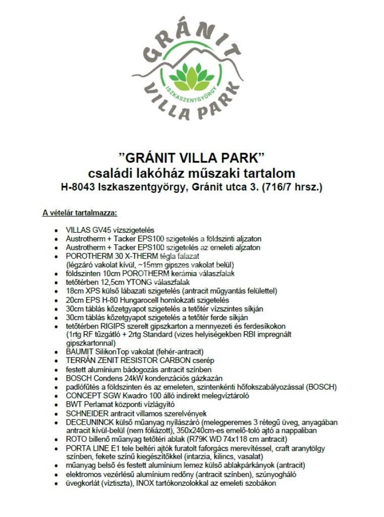 A Iszkaszentgyörgy-GRÁNIT Villapark, Székesfehérvártól csupán 5km-re, a Márványkert közelében található, 12 db önálló telken lévő 12 db önálló házzal rendelkezik, Házanként 152m2, 2 szint, saját telek (800m2- 925m2-ig), 20,5m2 terasz, minden ház 2 irányban tájolt, benapozott és átszellőztethető.
