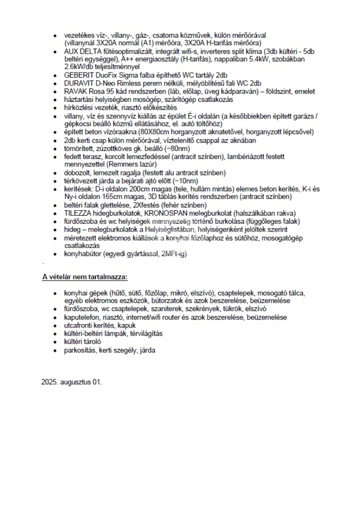 Az ingatlan összközműves, önálló helyrajzi számon lévő telekterületen az épület Porotherm 30 X-Therm téglából épült + 20cm szigeteléssel. A tető héjalása Terrán tetőcseréppel készült,. A fűtést szintenként szabályozható padlófűtés biztosítja. A melegvíz ellátás Heizer forróvíztároló biztosítja. A ház klimatizált , 5db beltéri egység található. A nyílászárók műanyag korszerű üvegezéssel, alumínium motoros redőnnyel ellátottak. A helyiségek burkolata, a beltéri ajtók, kapcsolók konnektorok… választhatók.