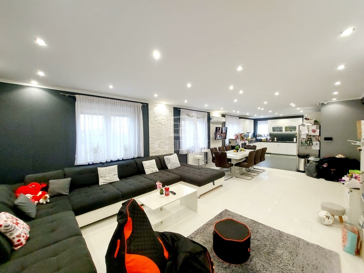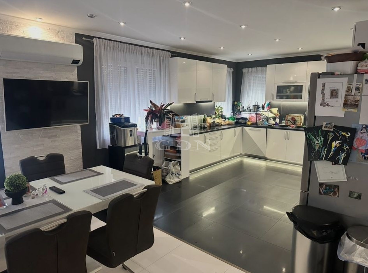 A lakható terület 148 nm, tágas amerikai konyhás nappali+ három háló, két fürdőszoba kádas-valamint zuhanyzós, kazánház, előtér-közlekedővel.