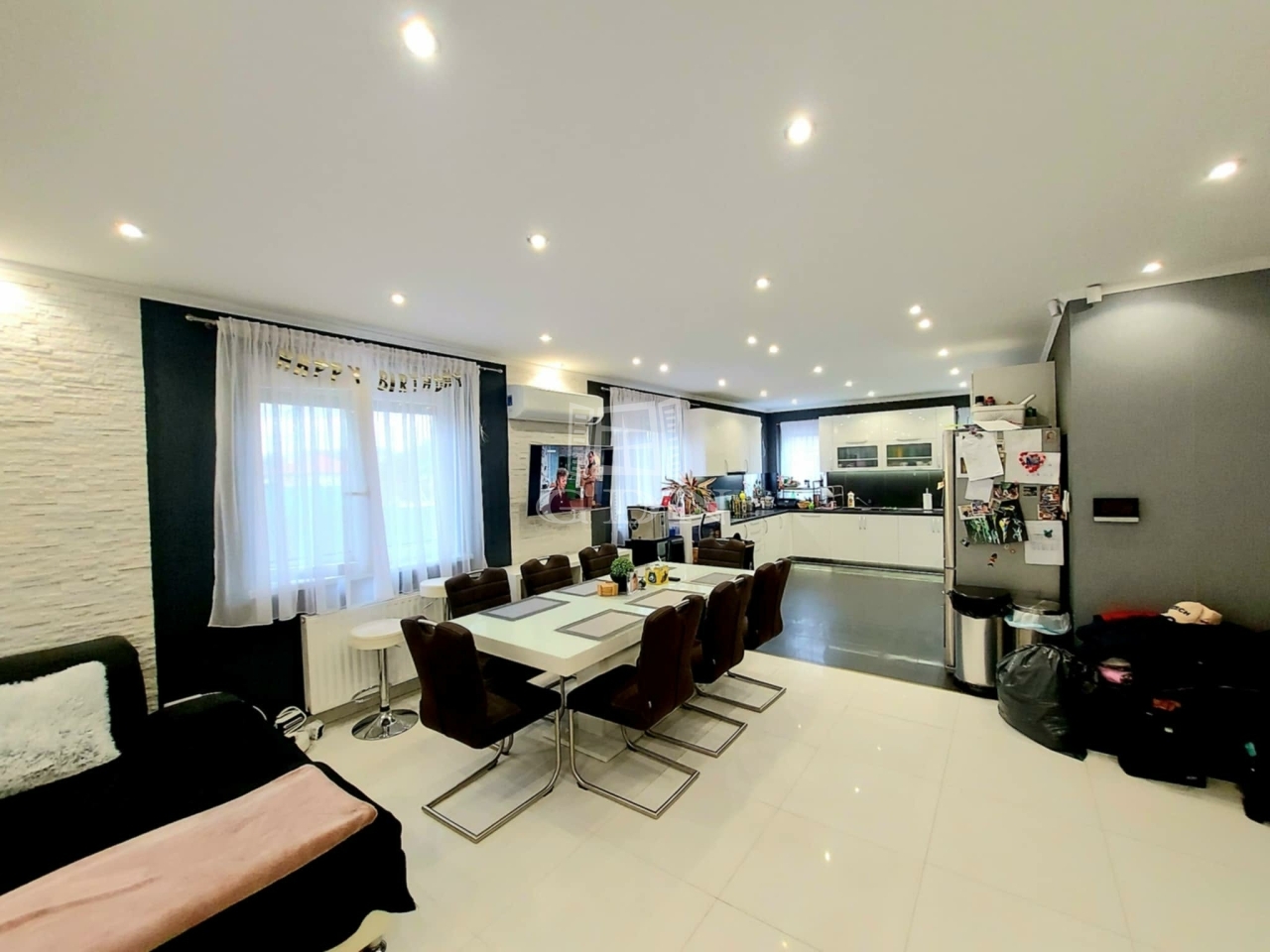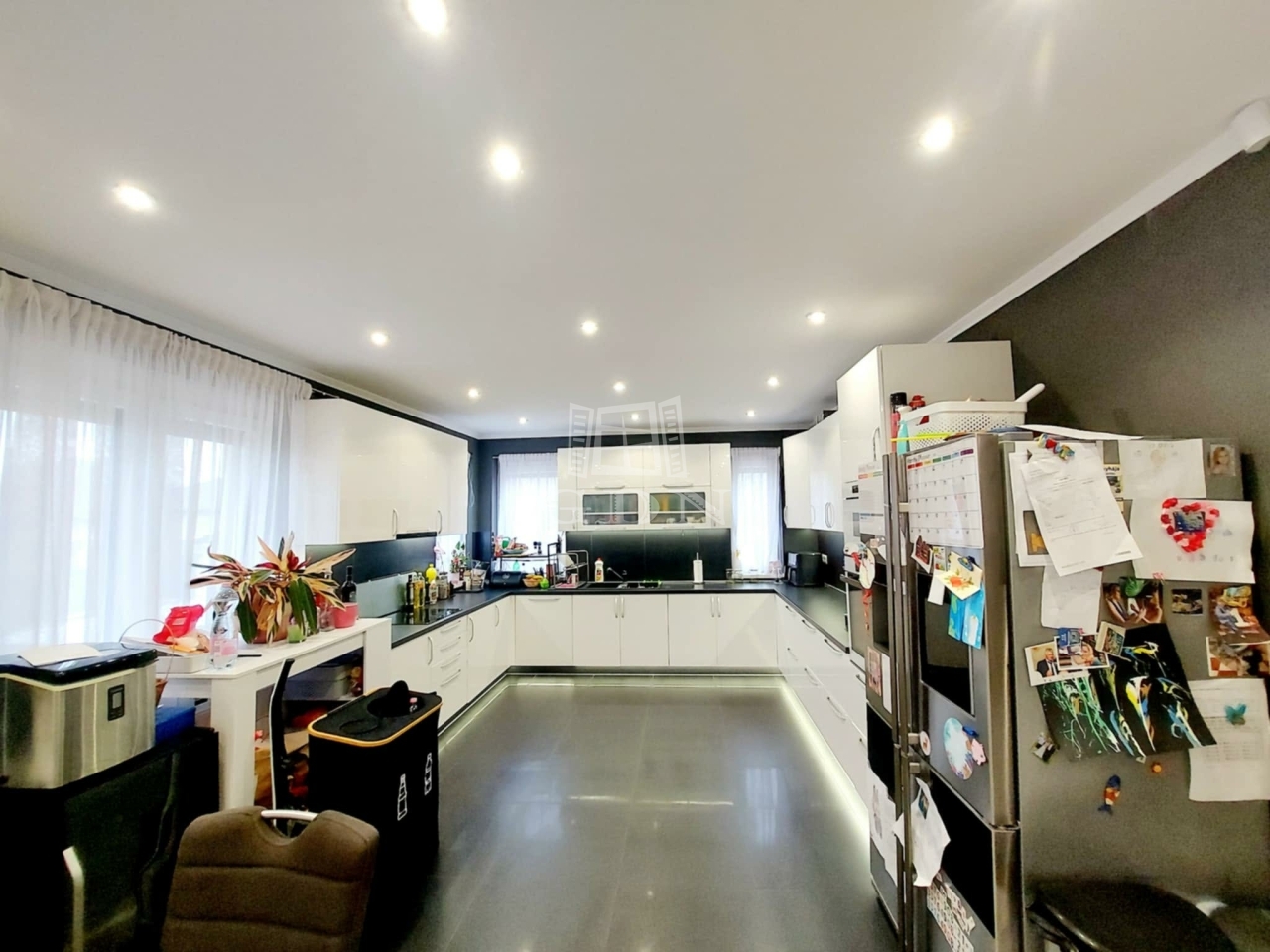 -Az egyedi tervezésű magasfényű gépesített konyha, indukciós főzőlap, páraelszívó,beépített mikróval, a konyhabútor ajtók és fiókok csillapítókkal vannak ellátva,