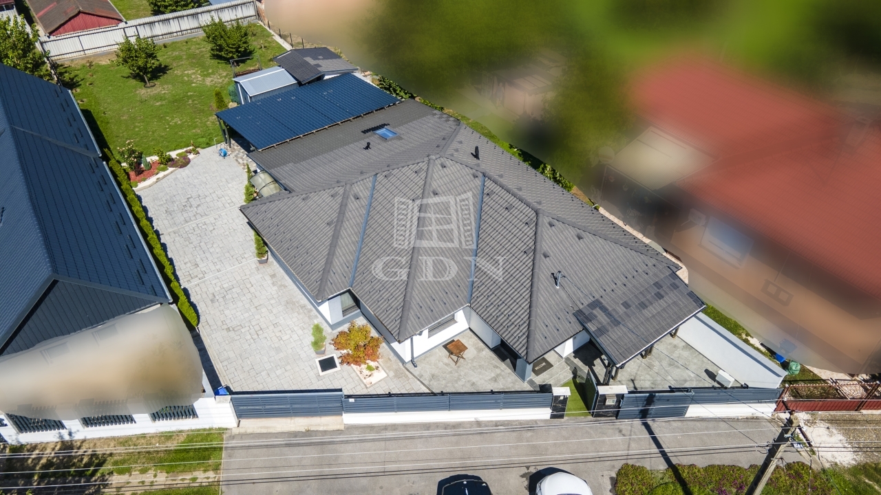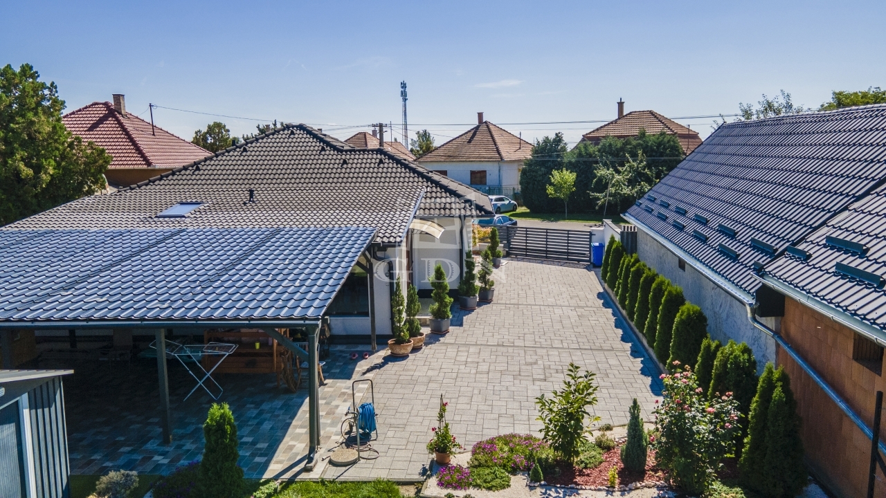 Az udvar részét képezi a 60 nm-es fedett terasz, mely egyben kocsibeálló is, valamint egy kinti zárt grillező és 3 tároló helyiség.