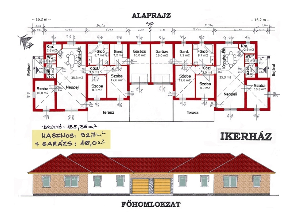 Kecskemét, Felsőszéktón, a Széles-köz közelében, rövid földút megközelítéssel, dinamikusan fejlődő, csendes, új családi házas övezetben saját, külön bejáratú 750 nm építési telken új építésű ikerháza eladó. Hőszigetelt könnyűszerkezetes falszerkezetű, 92 nm, hasznos lakóterű, nappali+3 szobás, 15 nm burkolt teraszos, 20 nm garázzsal. Nyílászárók fehér színű műanyagok, 3 rétegű üvegezéssel. Hőszivattyús fűtési rendszerrel, padlófűtéssel és 1 db hűtő-fűtő klímaberendezéssel kiegészítve. A vételár tartalmazza a tervezést, kertrendezést, füvesítést, térkövezést, és a kerítést is.