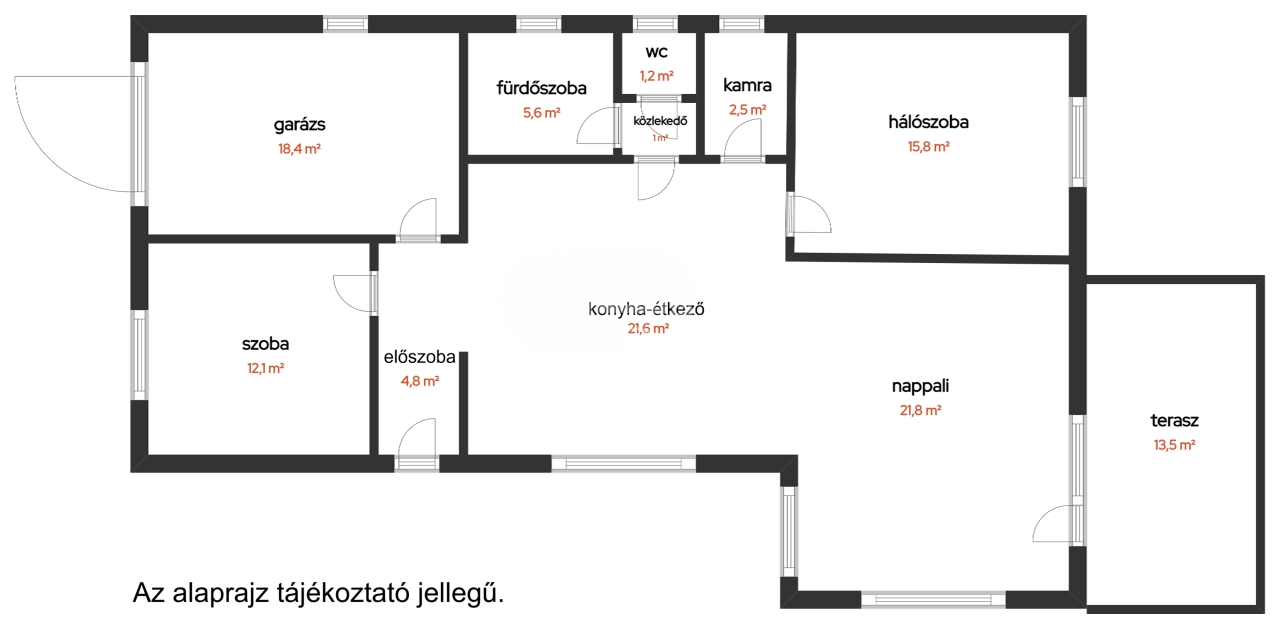 Konyha–étkező: 21,6 m²