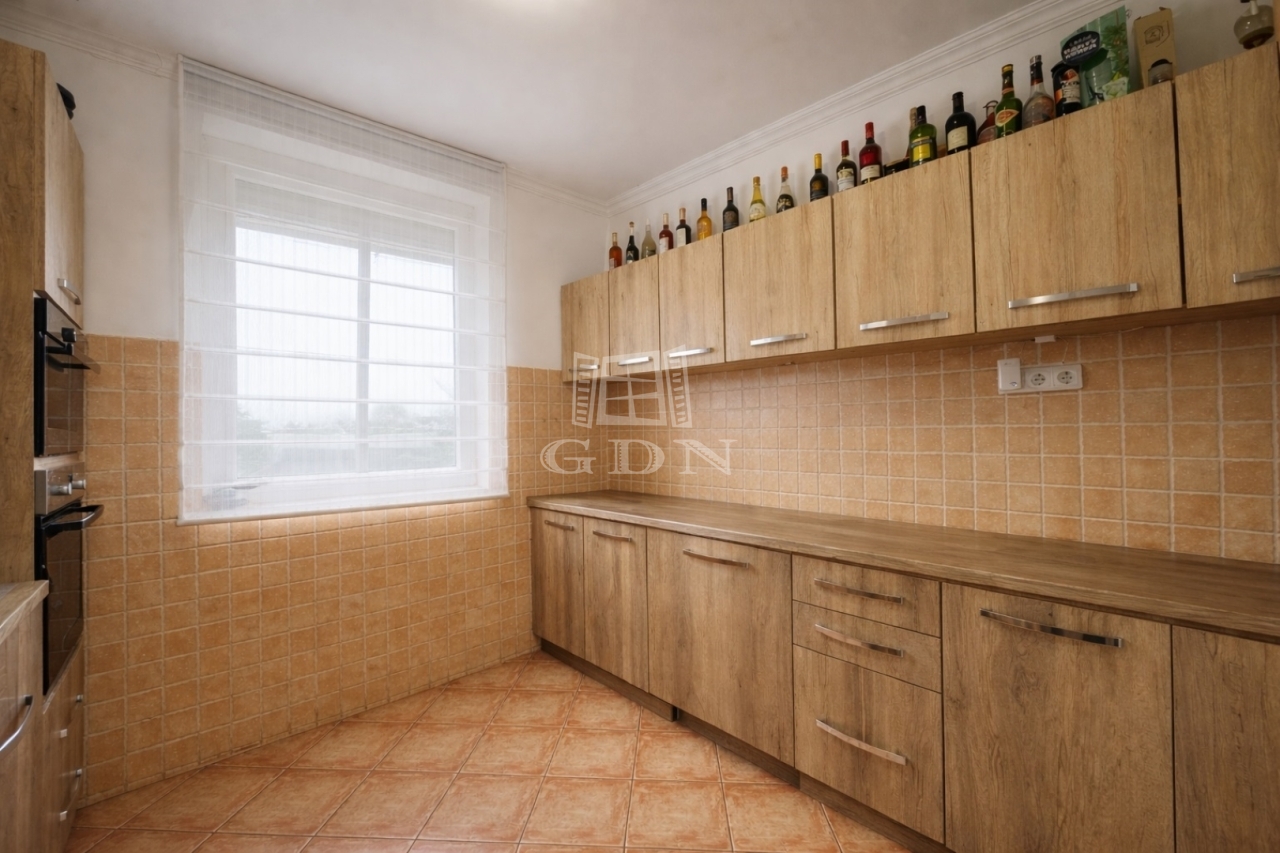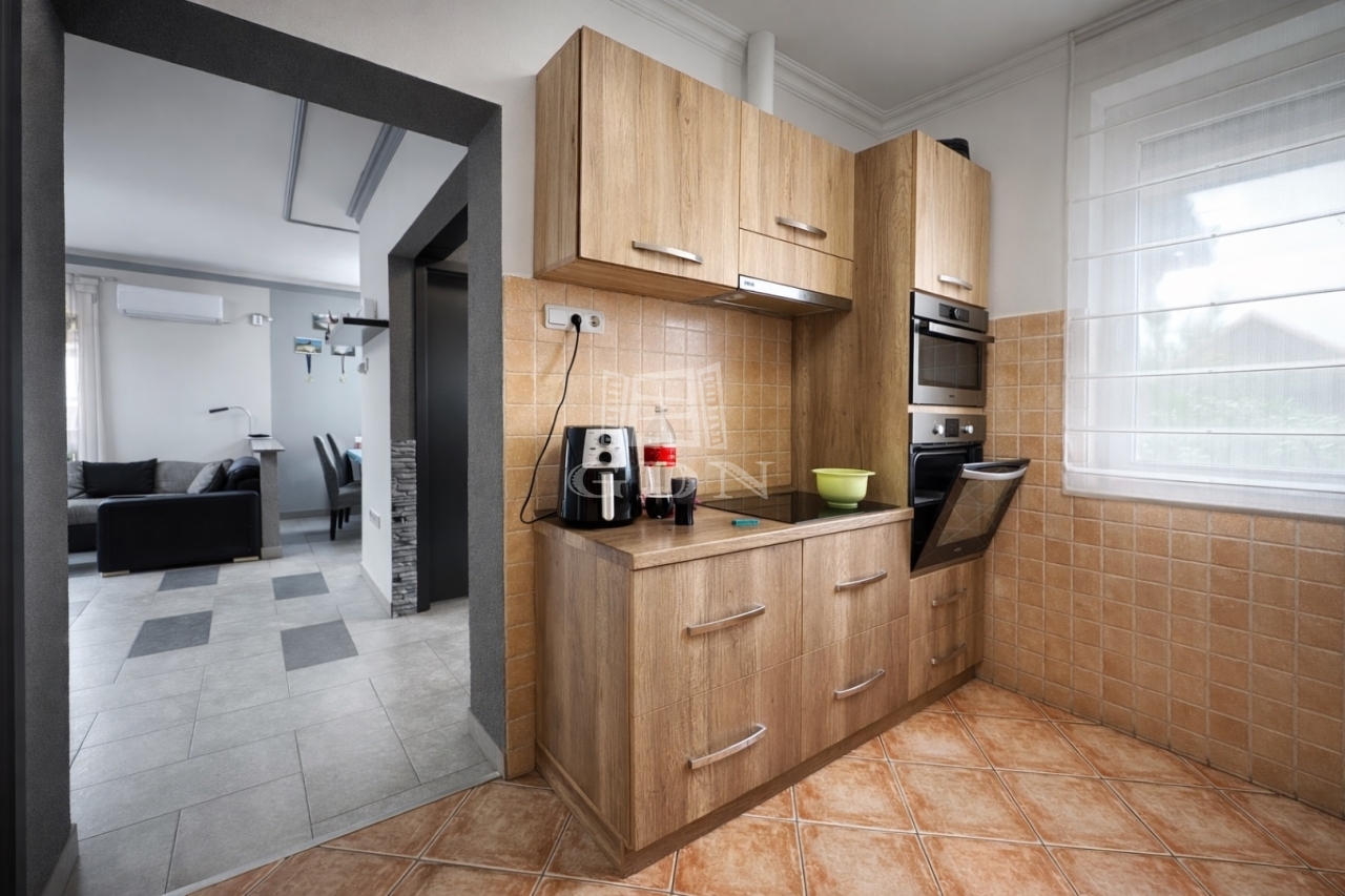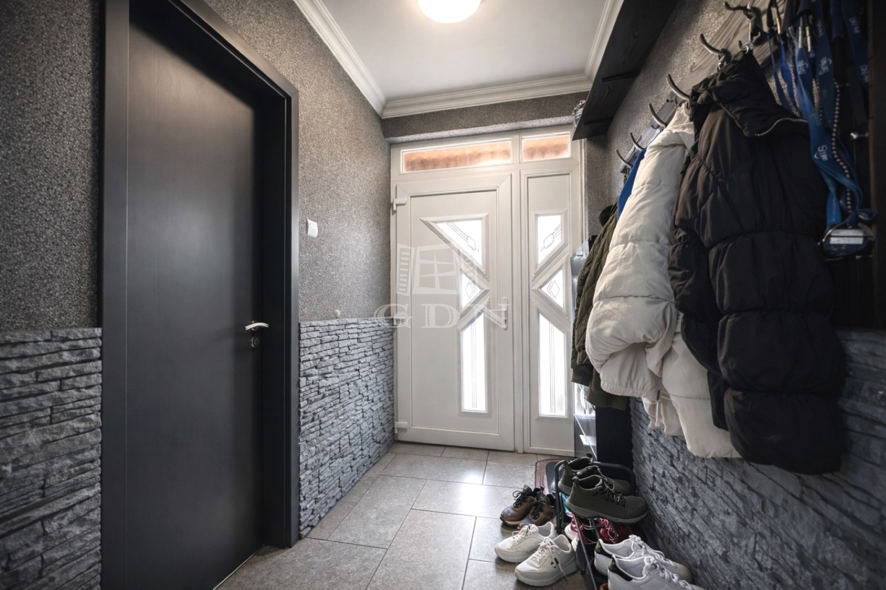Elosztását tekintve 115m2 hasznos alapterületű. Előszoba, vendég WC, nappali-étkező, konyha, kamra, 3 hálószoba és beépített terasz lett kialakítva.